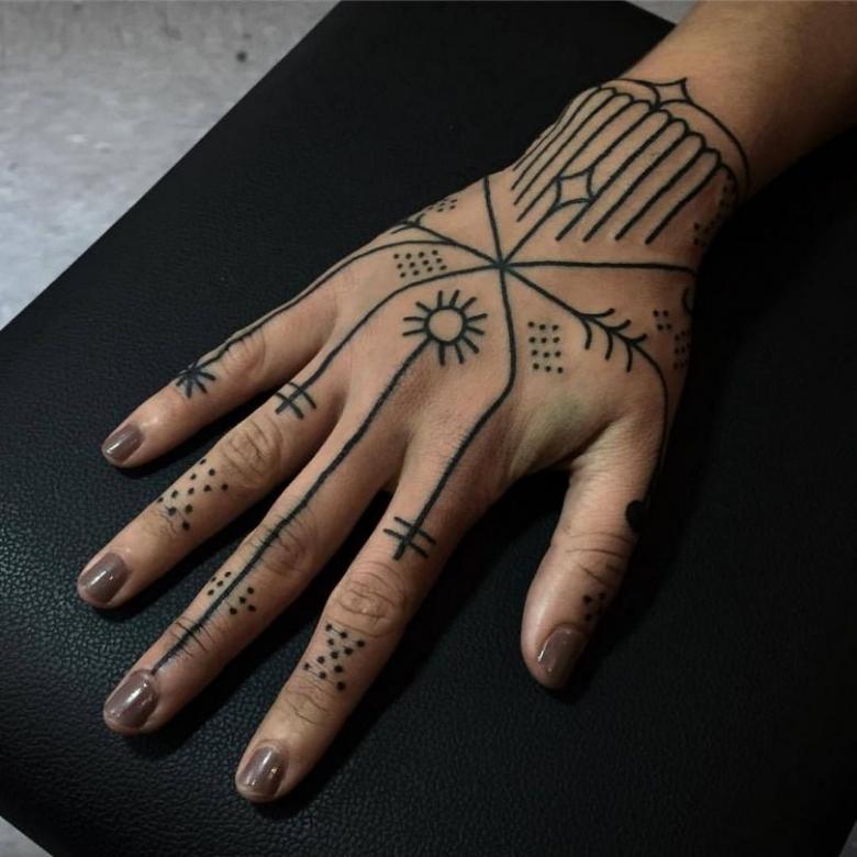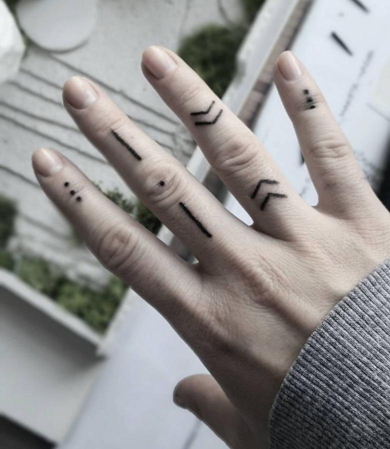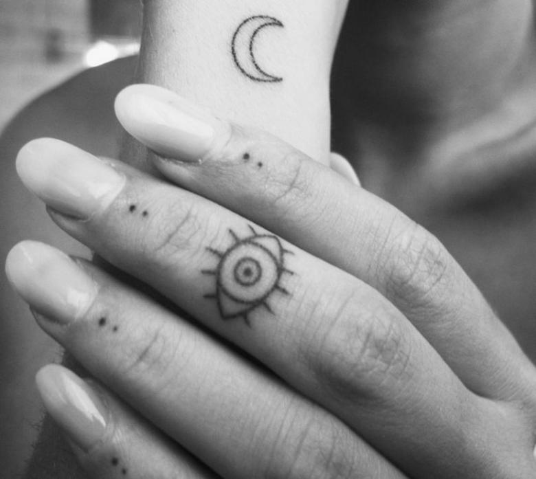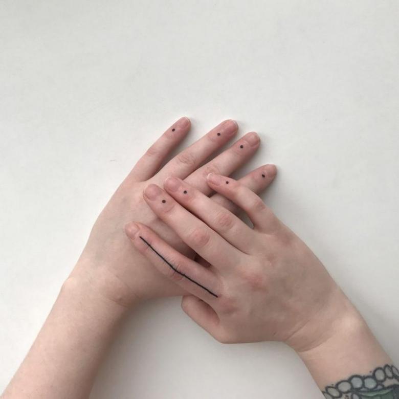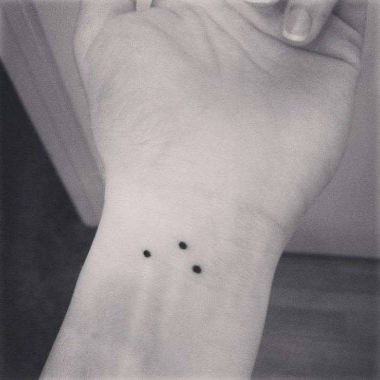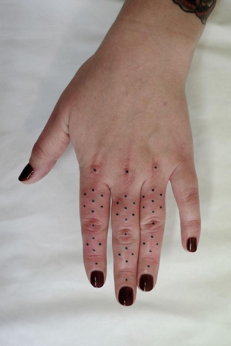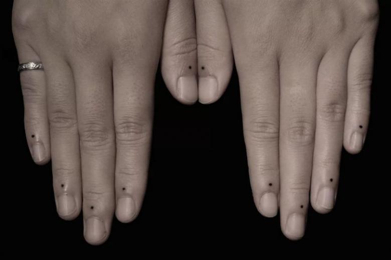 Les points de tatouage - l'origine et l'interprétation, les options (y compris trois points, cinq points, avec une virgule), l'emplacement de l'application (sur les mains, les doigts, sous les yeux), des photos amusantes du travail