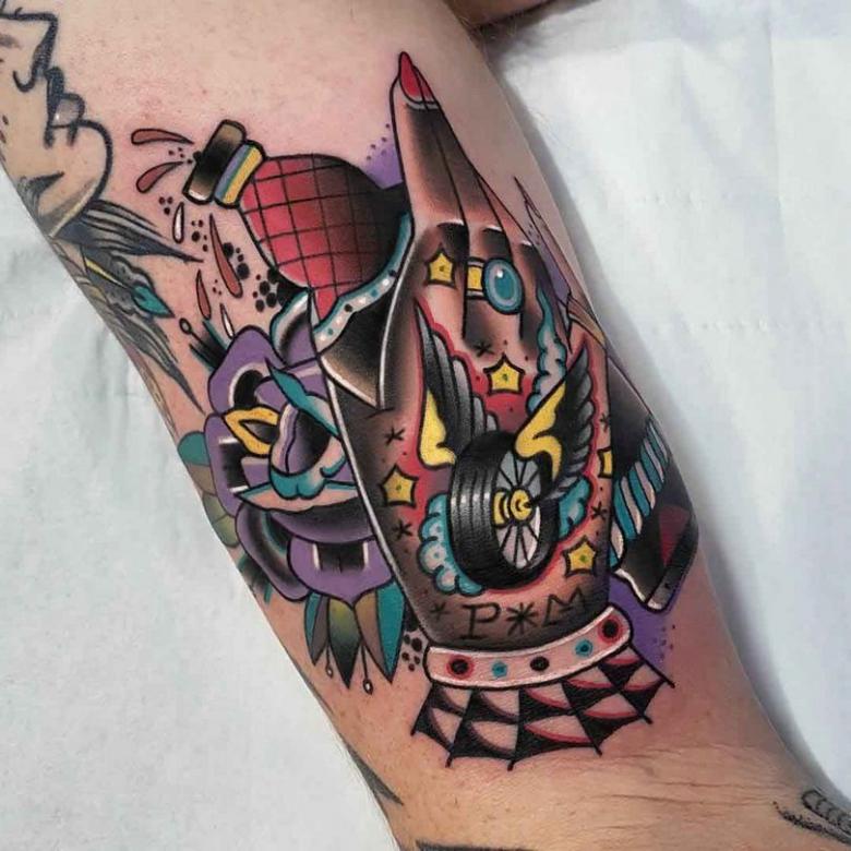 Les tons vibrants utilisés par les tatoueurs traditionnels étaient aussi principalement dus à ce qui était disponible lorsque les pigments étaient utilisés pour la peau, où ils n'atteignaient pas la plus haute qualité ou les avancées technologiques. Les encres de tatouage étaient limitées à ces couleurs particulières en raison de leur absence de décoloration, mais aussi de la disponibilité de l'encre à l'époque.