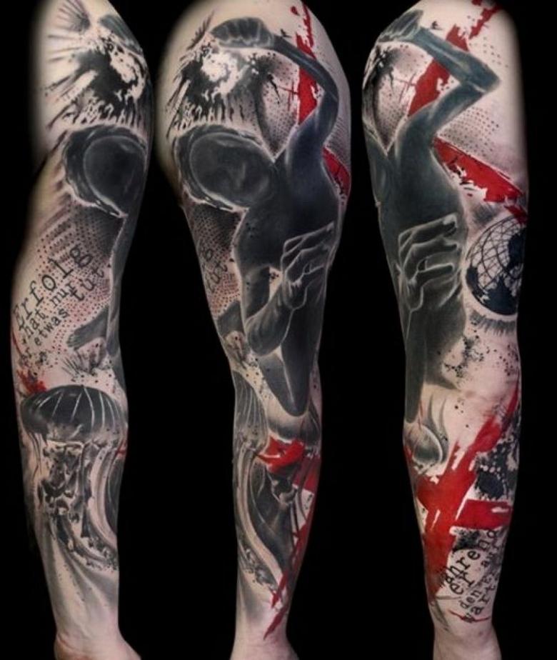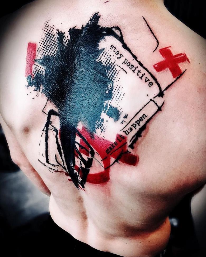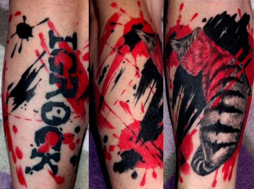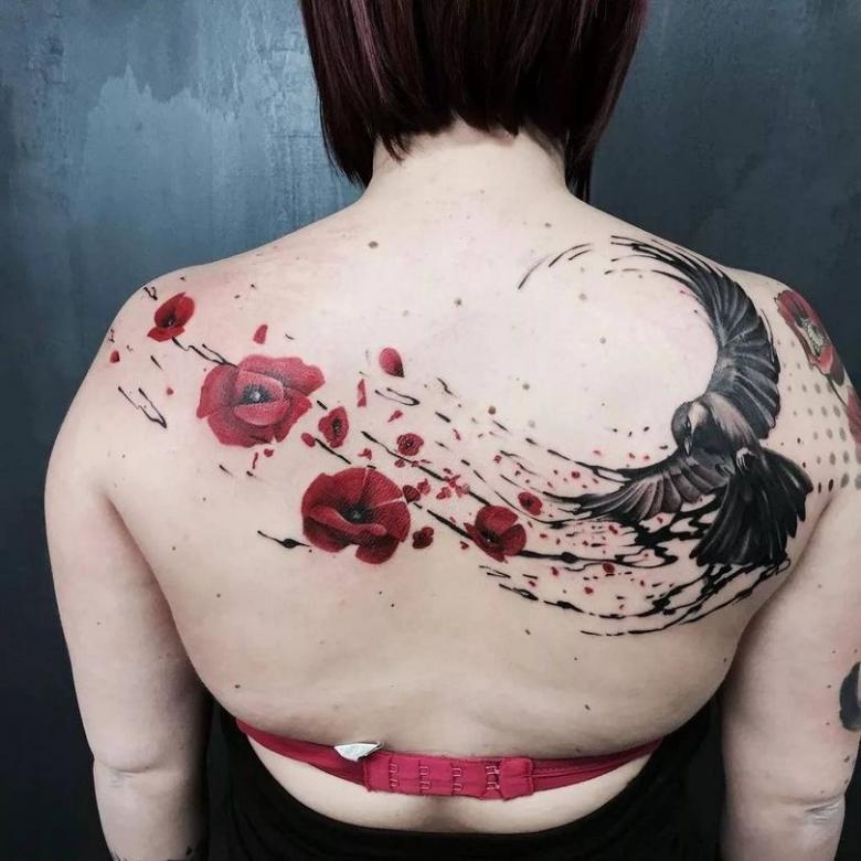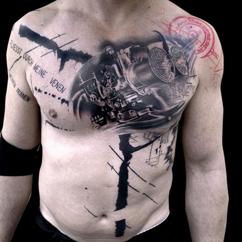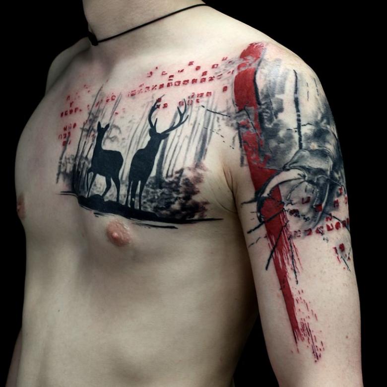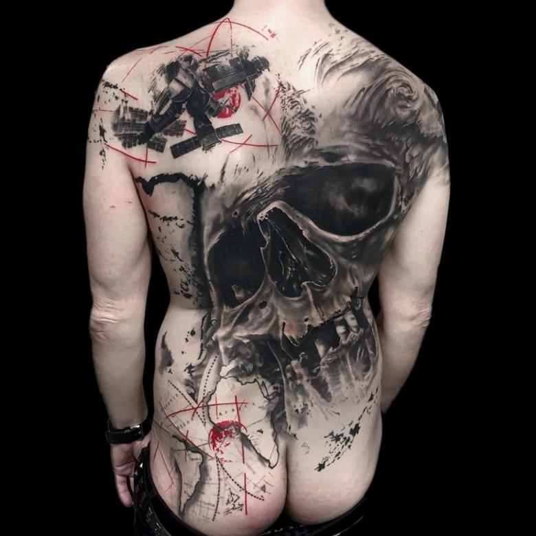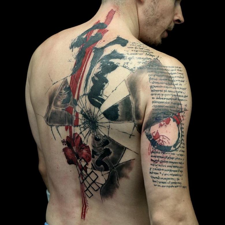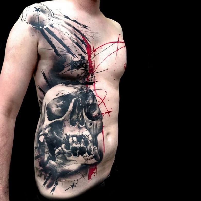 Les maîtres modernes, cependant, n'ont pas peur d'utiliser d'autres couleurs dans le motif, comme le bleu ou le rose vif. L'étymologie du nom du style est également particulière : "thrash" signifie littéralement "ordure" en anglais, mais cette partie doit être prise autrement, comme quelque chose qui transporte avec lui une agitation ; polka - danse folklorique rapide, ce mot caractérise la nature du style de ce tatouage et l'état interne du porteur de l'image, comme s'il cherchait à quitter la toile organique, à aller au-delà de leur réalité.