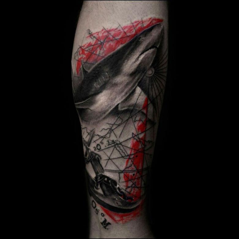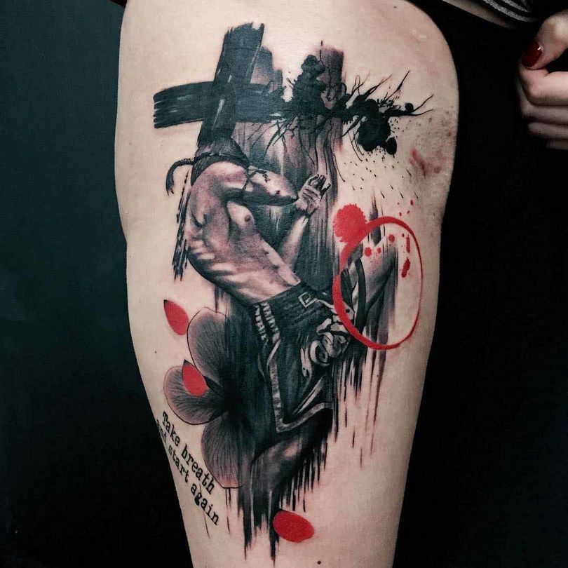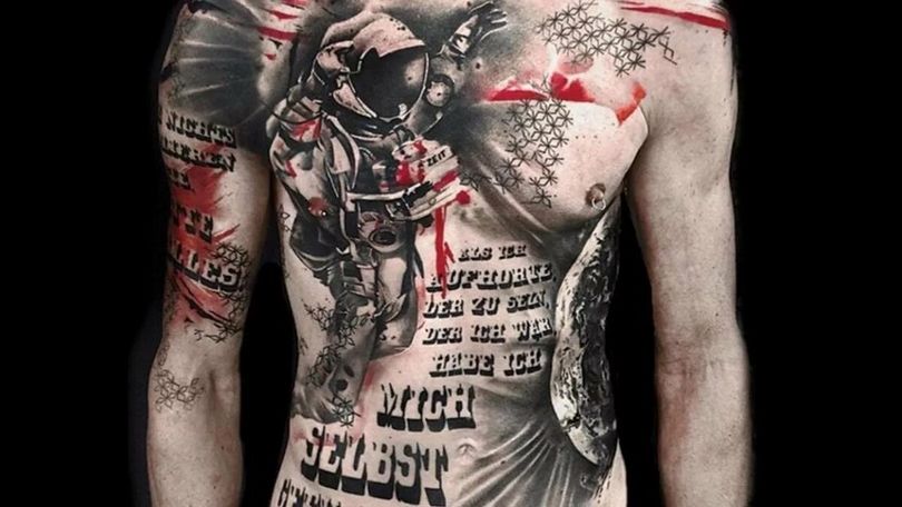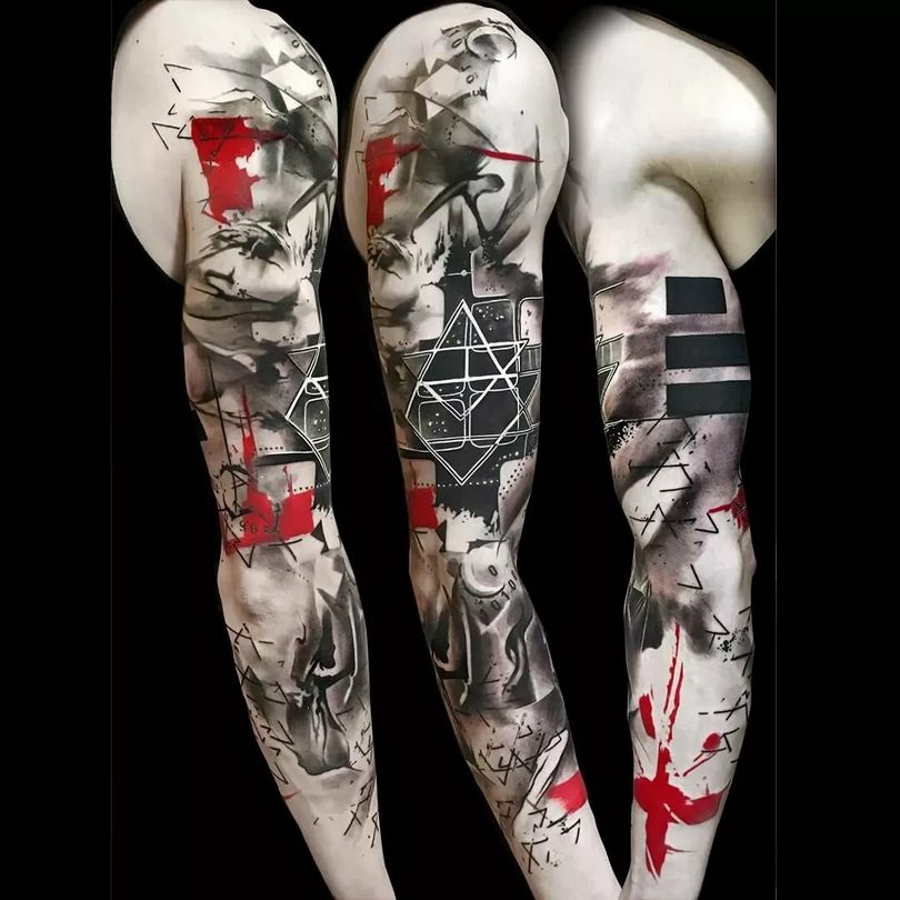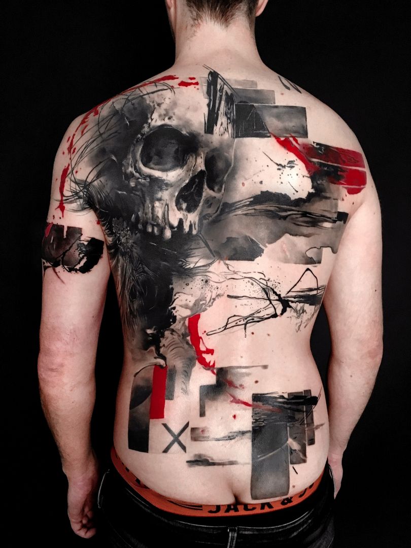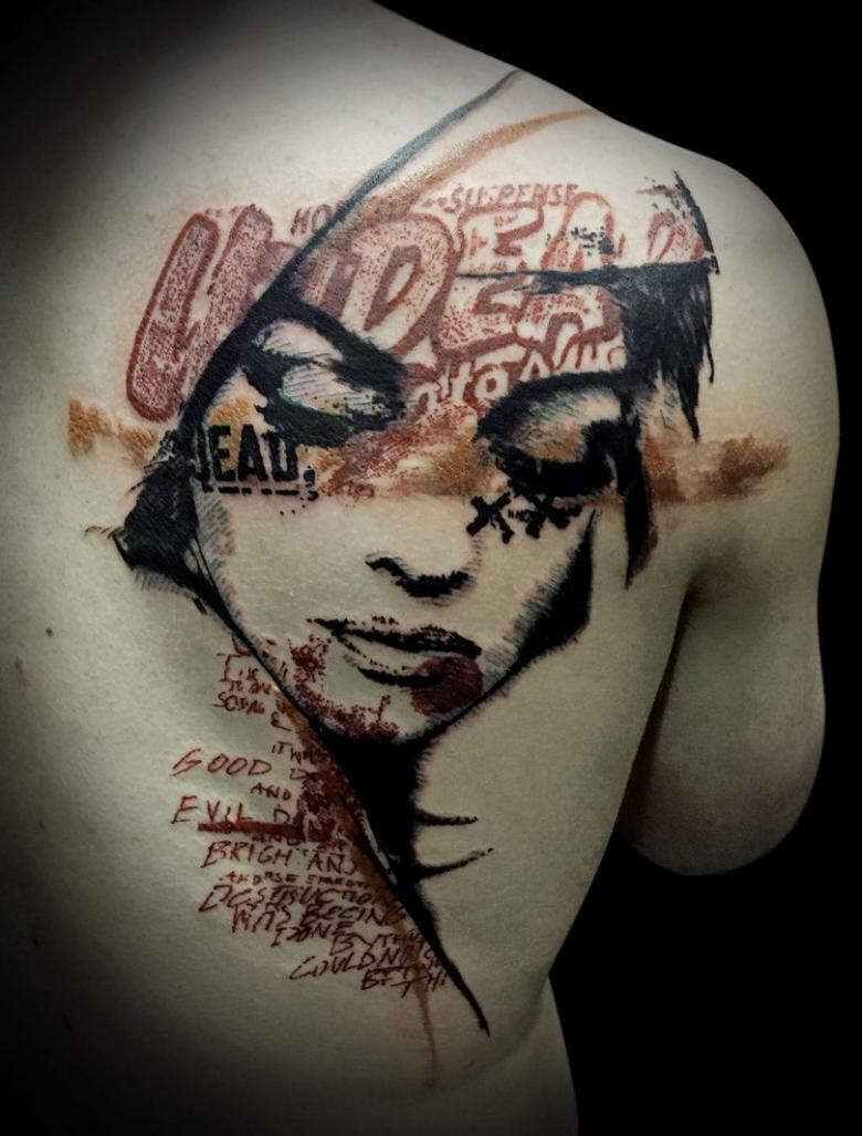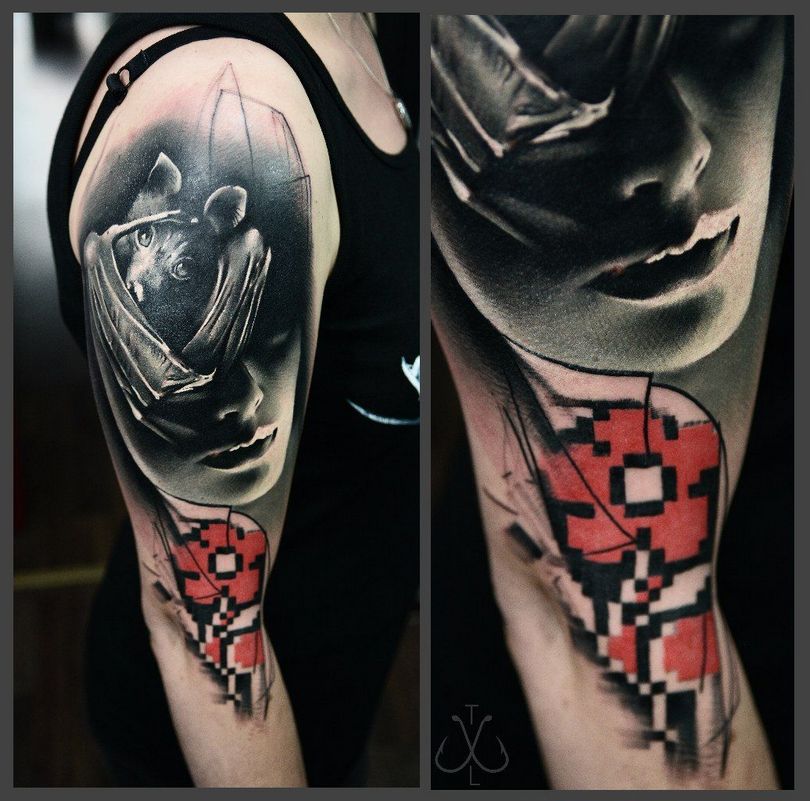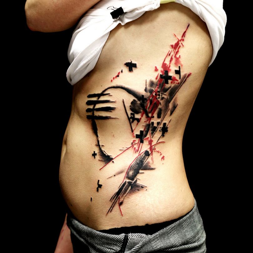 Les maîtres modernes, cependant, n'ont pas peur d'utiliser d'autres couleurs dans le motif, comme le bleu ou le rose vif. L'étymologie du nom du style est également particulière : "thrash" signifie littéralement "ordure" en anglais, mais cette partie doit être prise autrement, comme quelque chose qui transporte avec lui une agitation ; polka - danse folklorique rapide, ce mot caractérise la nature du style de ce tatouage et l'état interne du porteur de l'image, comme s'il cherchait à quitter la toile organique, à aller au-delà de leur réalité.