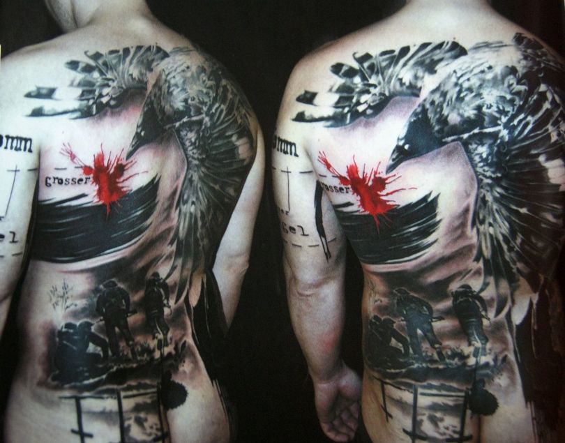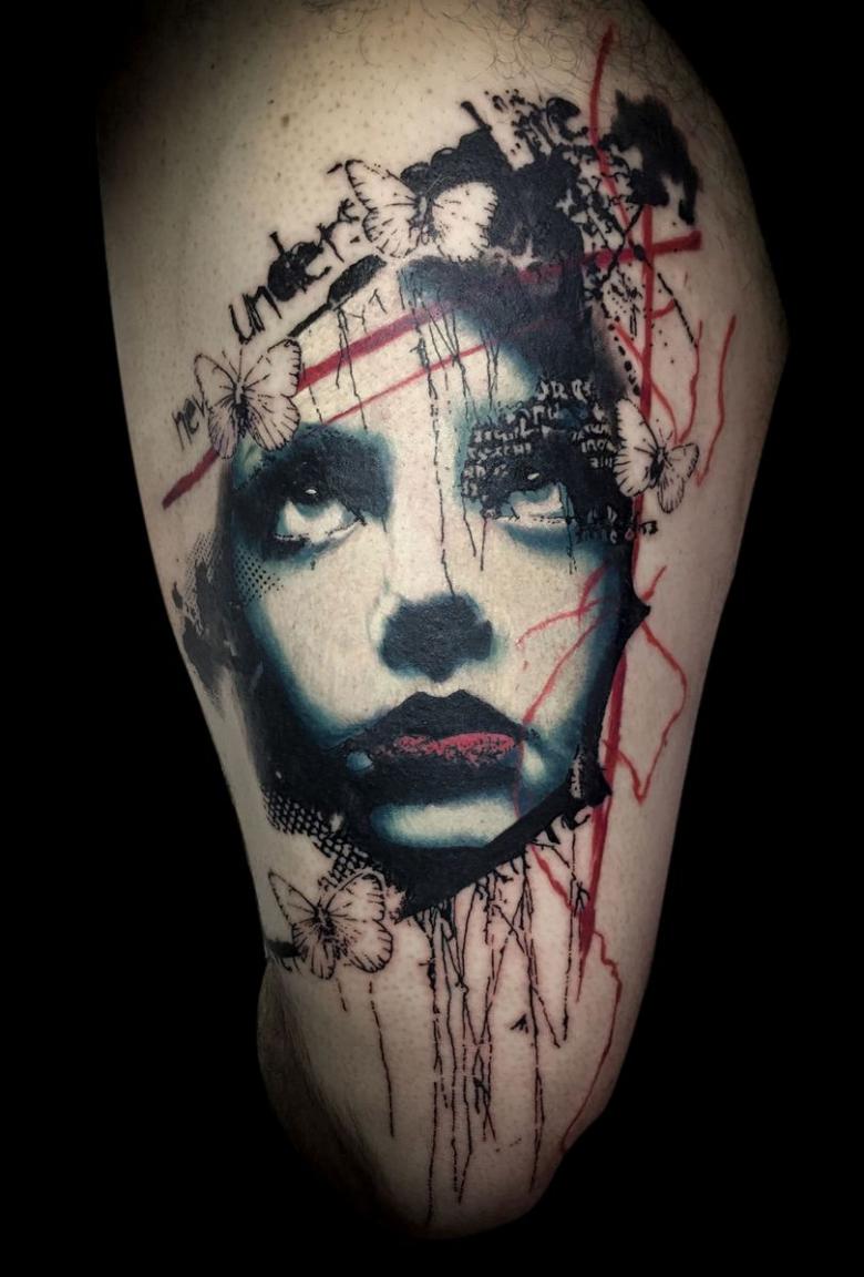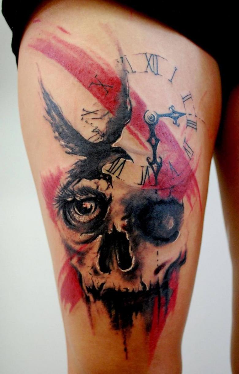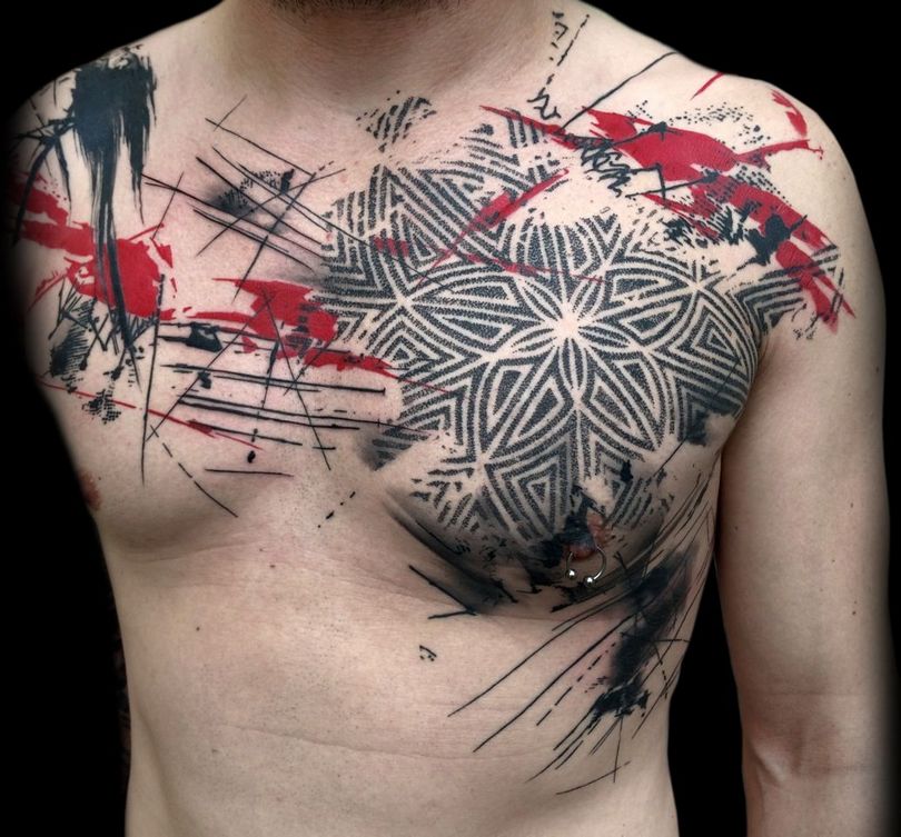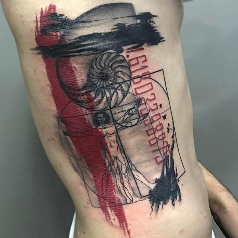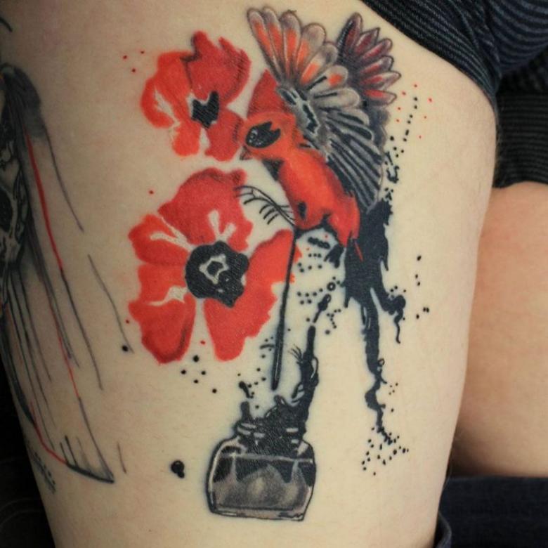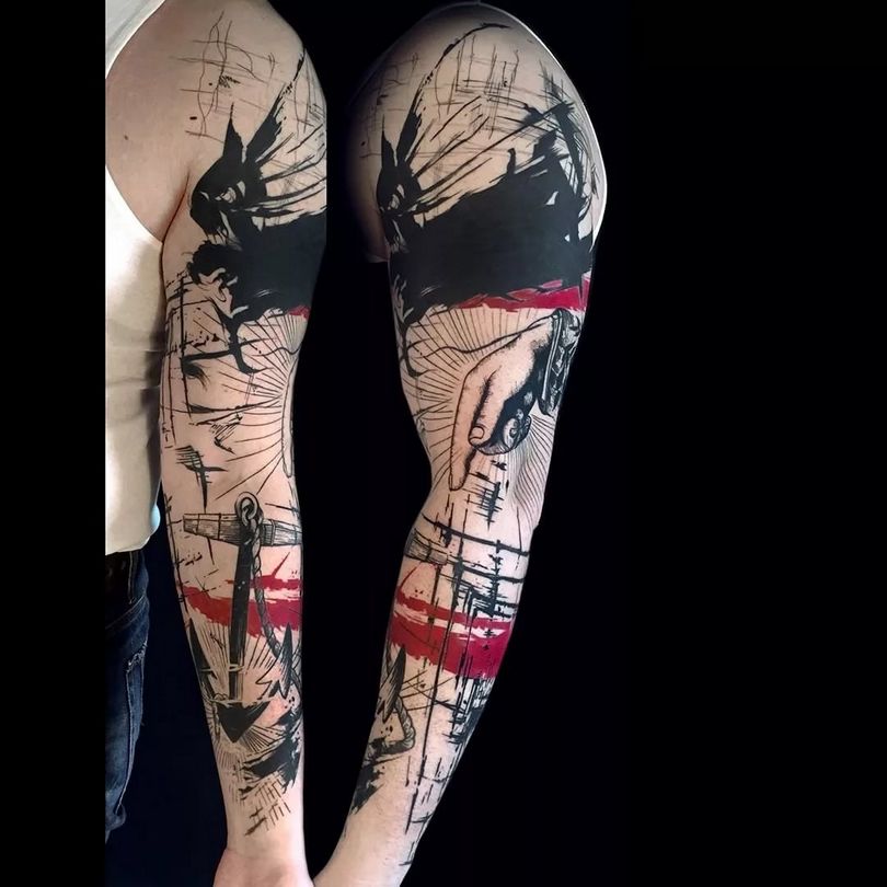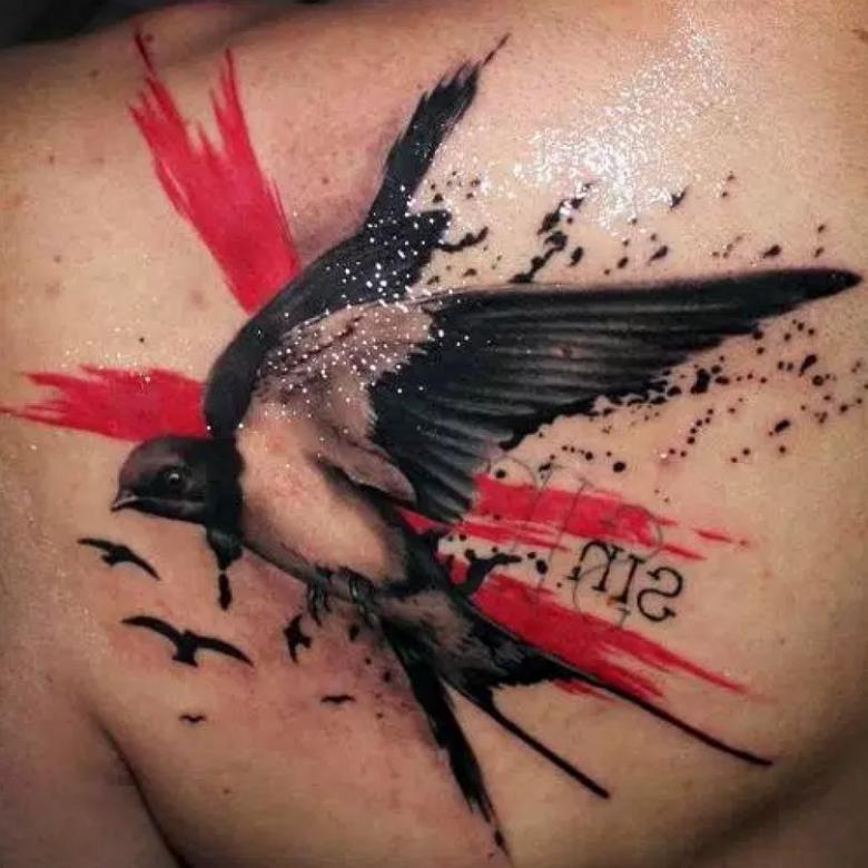 Les maîtres modernes, cependant, n'ont pas peur d'utiliser d'autres couleurs dans le motif, comme le bleu ou le rose vif. L'étymologie du nom du style est également particulière : "thrash" signifie littéralement "ordure" en anglais, mais cette partie doit être prise autrement, comme quelque chose qui transporte avec lui une agitation ; polka - danse folklorique rapide, ce mot caractérise la nature du style de ce tatouage et l'état interne du porteur de l'image, comme s'il cherchait à quitter la toile organique, à aller au-delà de leur réalité.