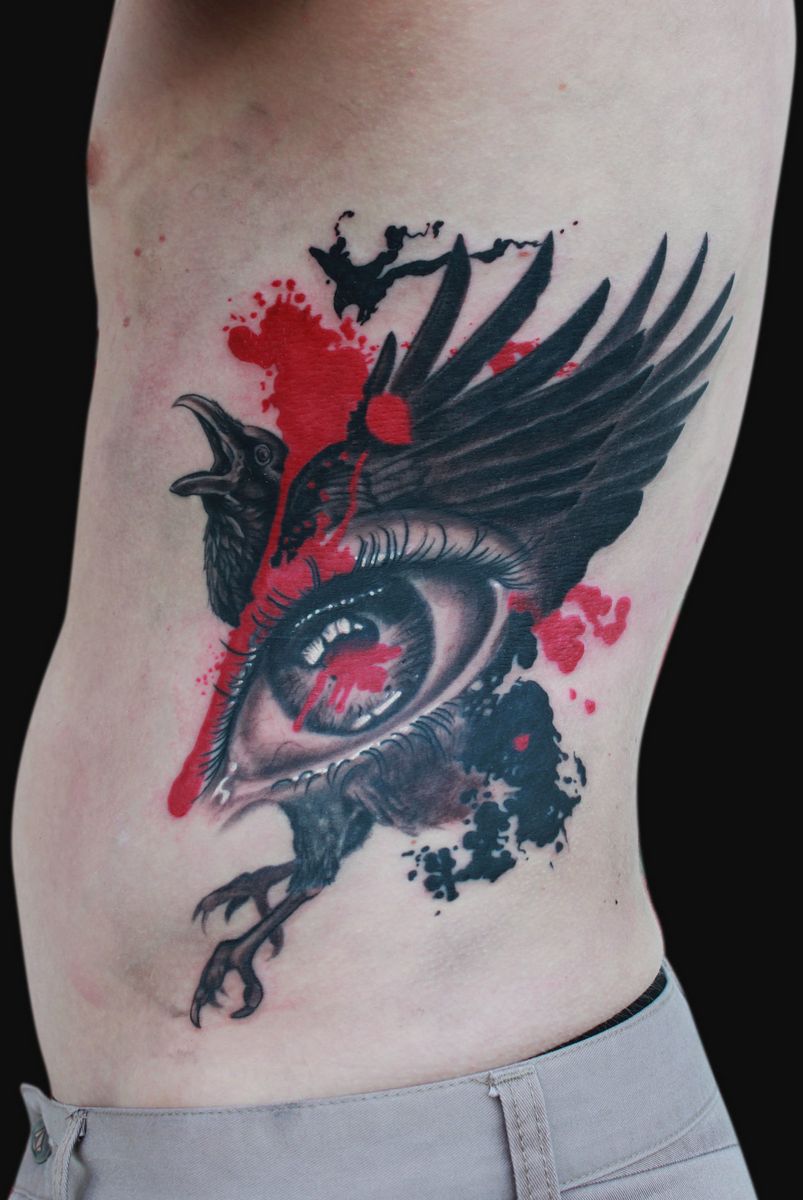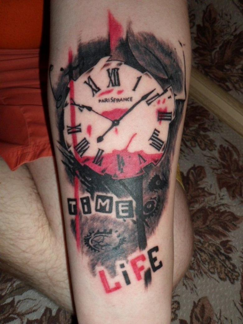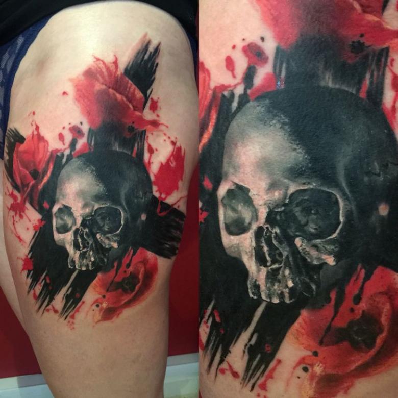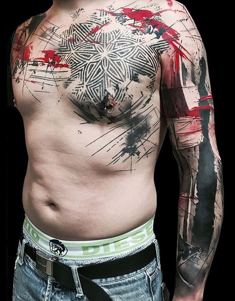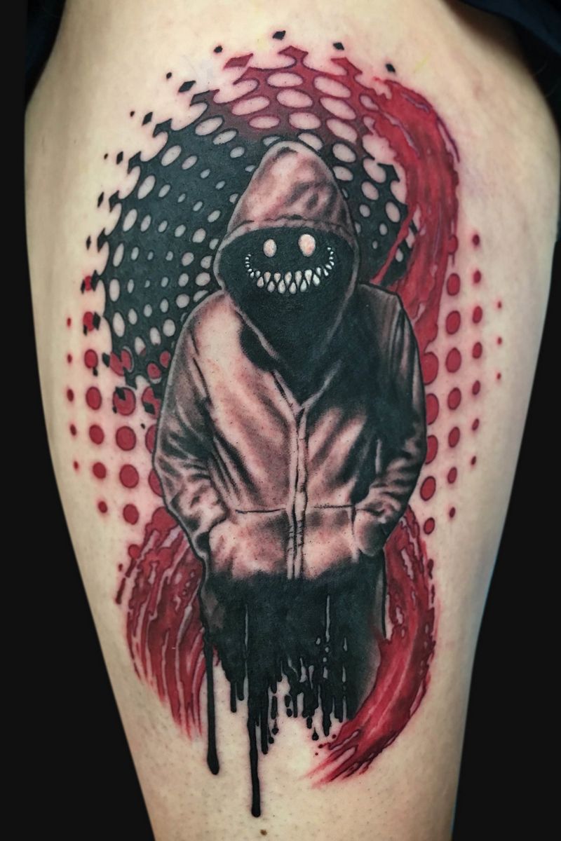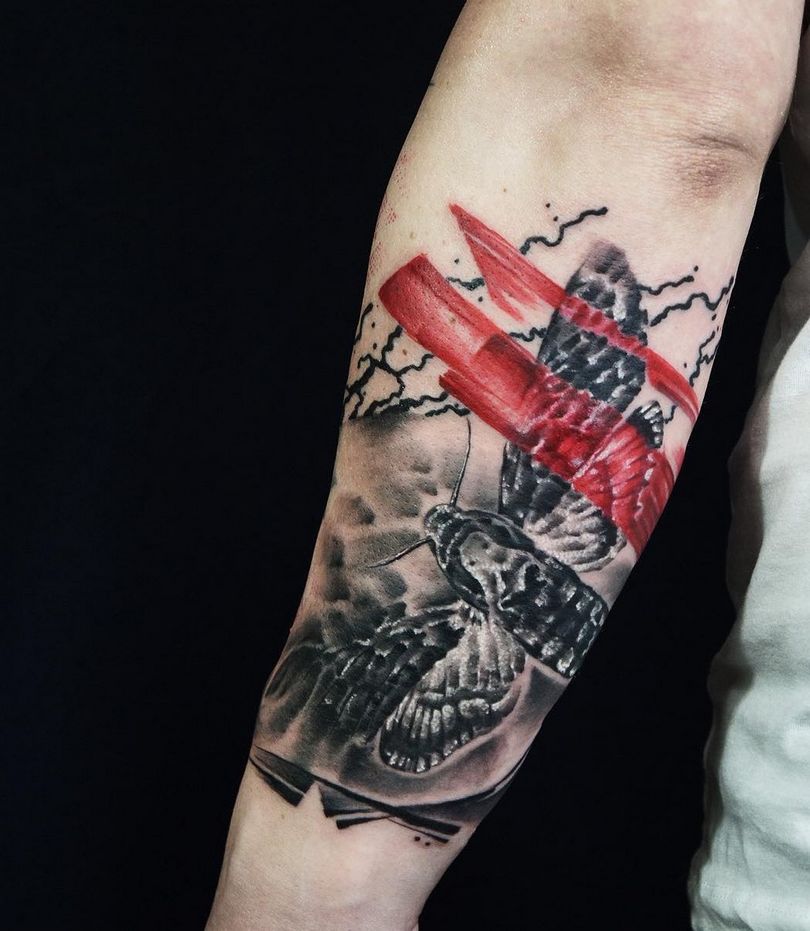 Les maîtres modernes, cependant, n'ont pas peur d'utiliser d'autres couleurs dans le motif, comme le bleu ou le rose vif. L'étymologie du nom du style est également particulière : "thrash" signifie littéralement "ordure" en anglais, mais cette partie doit être prise autrement, comme quelque chose qui transporte avec lui une agitation ; polka - danse folklorique rapide, ce mot caractérise la nature du style de ce tatouage et l'état interne du porteur de l'image, comme s'il cherchait à quitter la toile organique, à aller au-delà de leur réalité.
