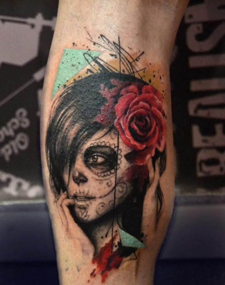 - Crânes et os. L'élément le plus souvent représenté chez les filles et les jeunes hommes. C'est ainsi que les gens expriment leur intrépidité et leur mépris de la mort, le jour de beaucoup est aussi un talisman, mais surtout, c'est simplement un élément qui remet en question la société et les normes morales et les mœurs établies ;