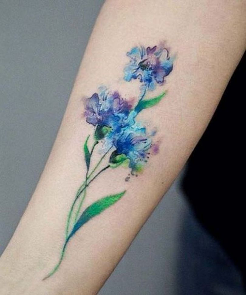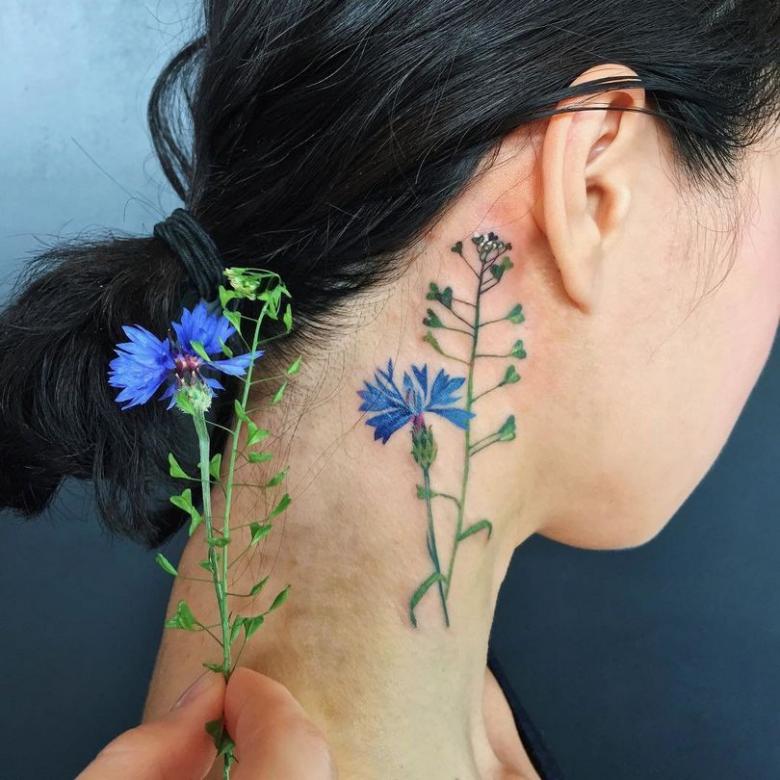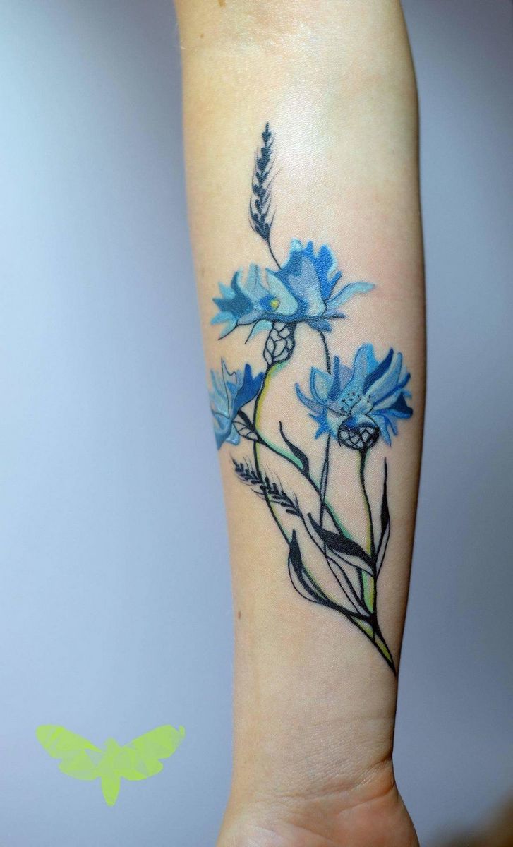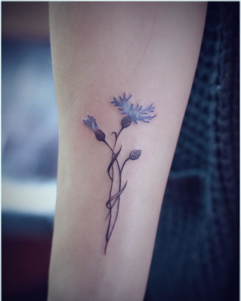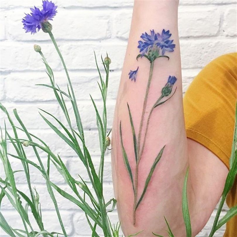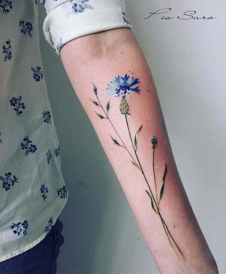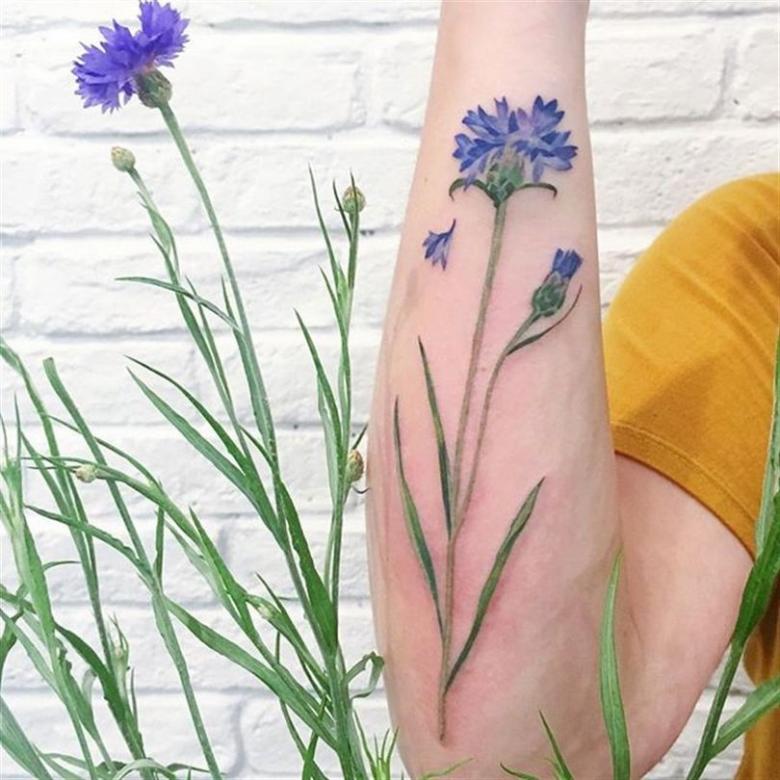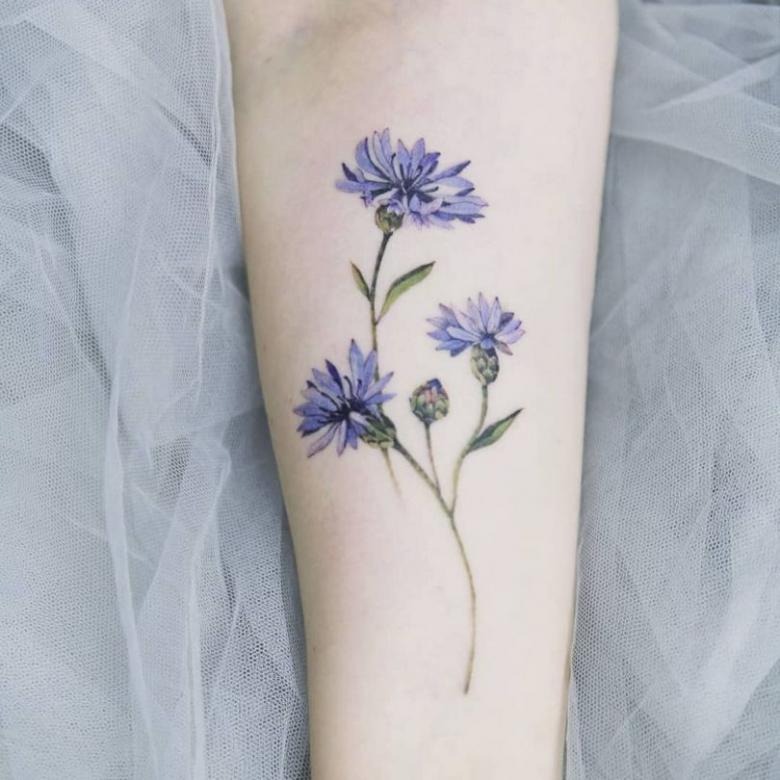 Tatouage bleuet - significations pour les filles et les hommes, où l'appliquer (sur le bras, la jambe, la clavicule, le poignet), croquis originaux et idées de photos