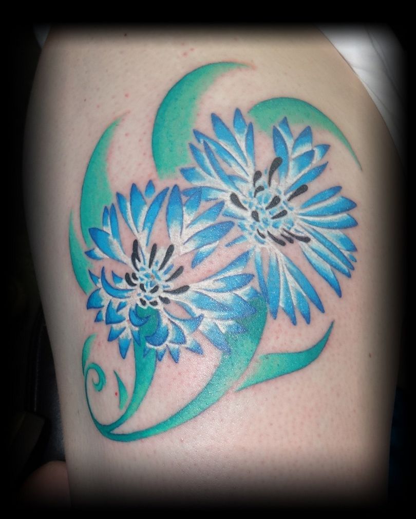 Si le tatouage bleuet est de nature ésotérique, il peut comporter des cercles concentriques, des sigils et des étoiles, des signes kabbalistiques près ou autour de l'élément principal. Mais le plus souvent, c'est la beauté naturelle de cette charmante plante qui est mise en avant.