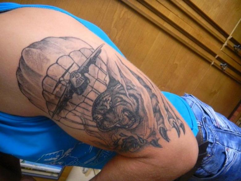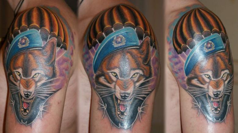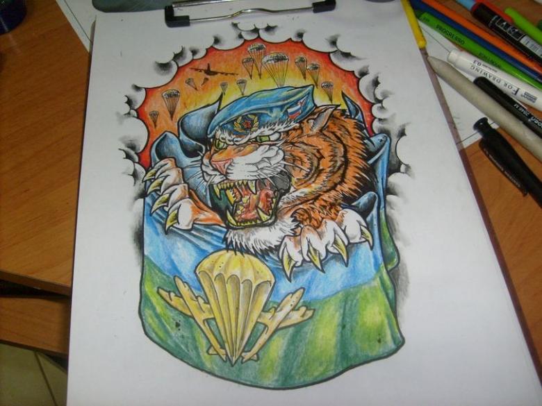 Comme mentionné précédemment, ce type de tatouage a quelques attributs et règles obligatoires, mais une autre caractéristique des tatouages de l'armée doit être notée. Souvent, un animal prédateur, tel qu'un tigre, peut être au premier plan de la composition. Parfois, les clients choisissent l'image d'un ours ou d'un loup. Le principal inconvénient de ces croquis est la mauvaise qualité de l'image. Mais on y prête rarement attention, car l'esthétique n'est pas l'essentiel dans le Tattoo Airborne.