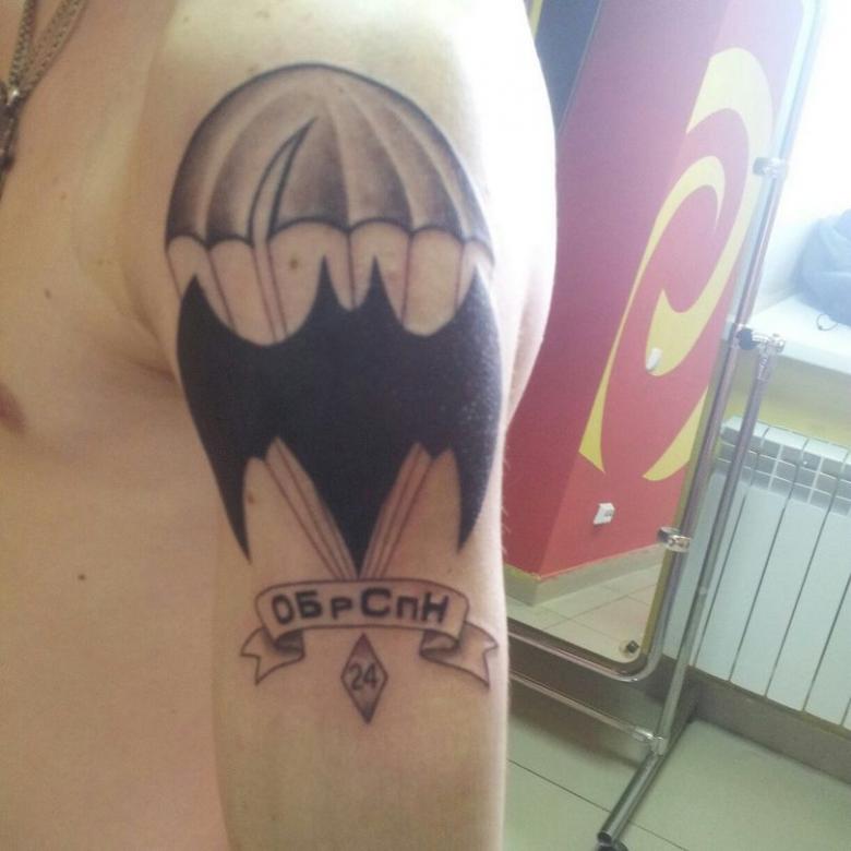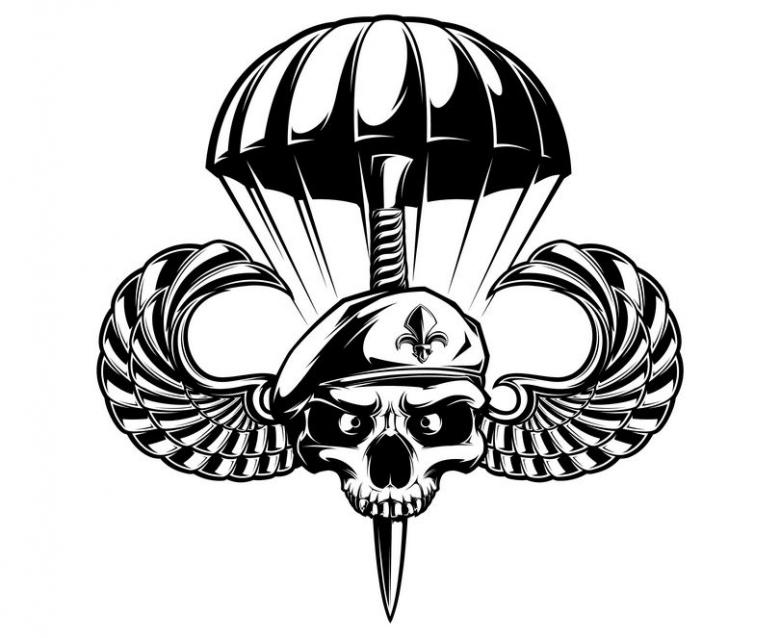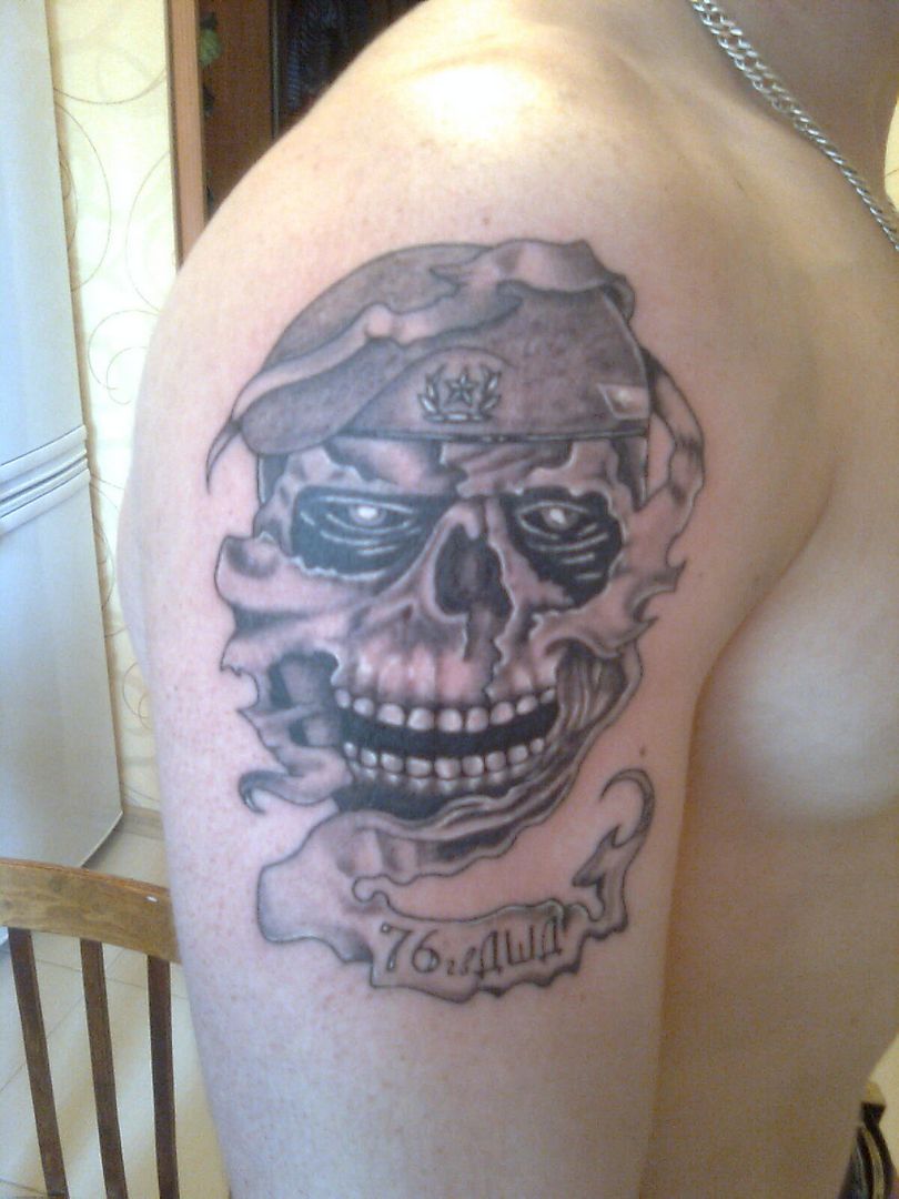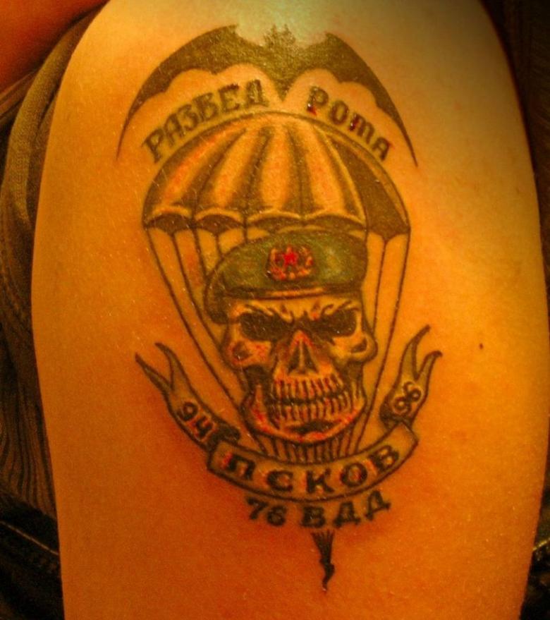 Très populaire parmi les parachutistes est l'image du crâne humain, habillé d'un béret. La composition peut être complétée par un couteau serré dans les dents du crâne, des fusils d'assaut Kalachnikov ou des personnes dans le feu de la guerre. Ce tatouage signifie l'intrépidité, la disposition à la mort et la bravoure des soldats. Le crâne est également reconnu comme un élément dissuasif pour les ennemis. Il est généralement inscrit sur la poitrine, le dos ou les bras.