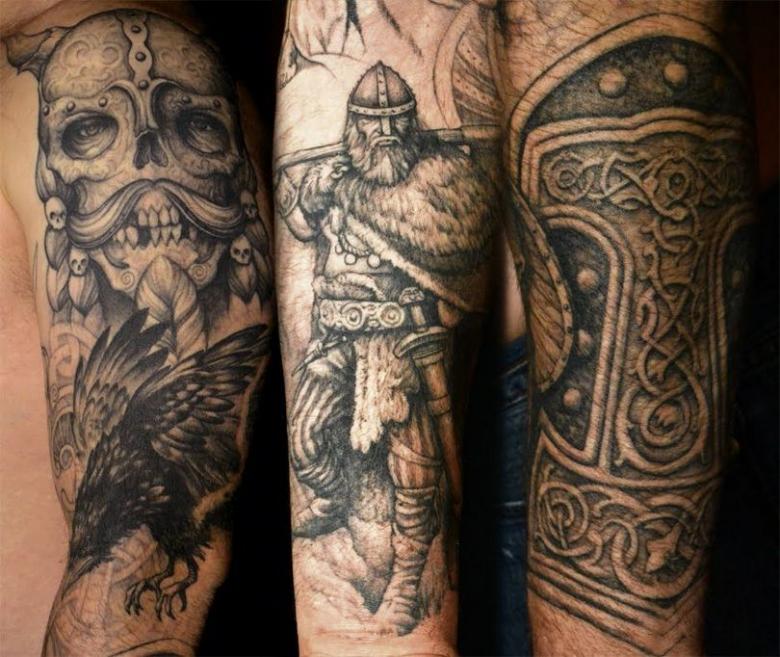 Tatouages avec des Vikings - croquis d'hommes avec runes, haches, bateaux, boussoles, casques, corbeaux, lieux, photos