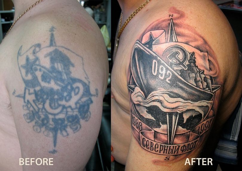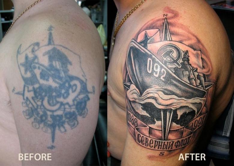 - Les inscriptions sont le nom de la marine, les numéros d'unité ou de base de la marine, le nom du navire, le groupe sanguin et le facteur Rh. Très populaire dans la marine, le tatouage est constitué de différentes abréviations ou noms de marines : Nord, Baltique, Mer Noire, Pacifique.