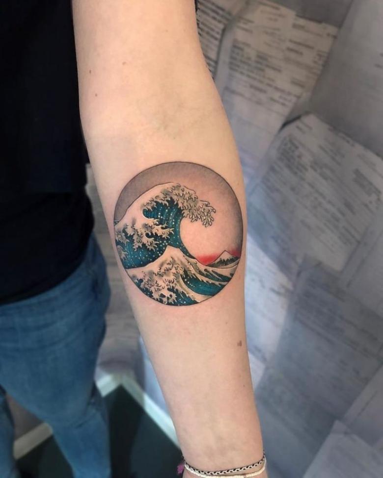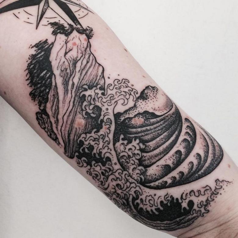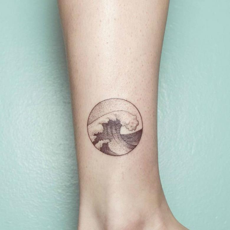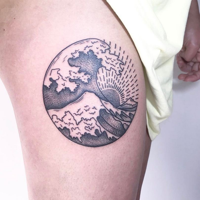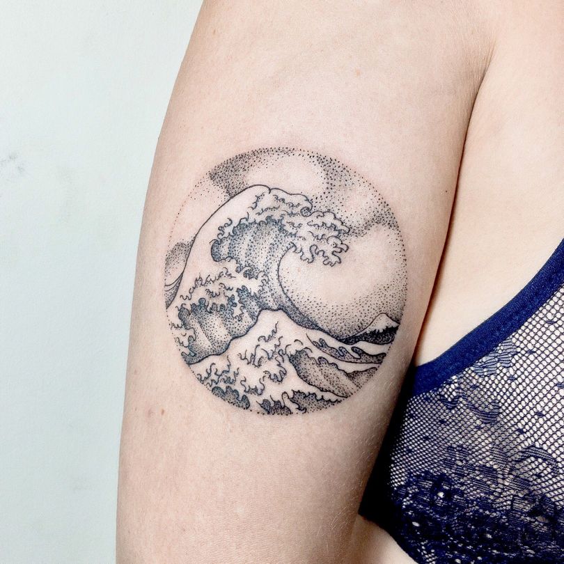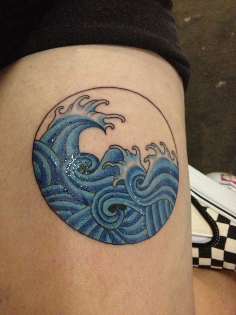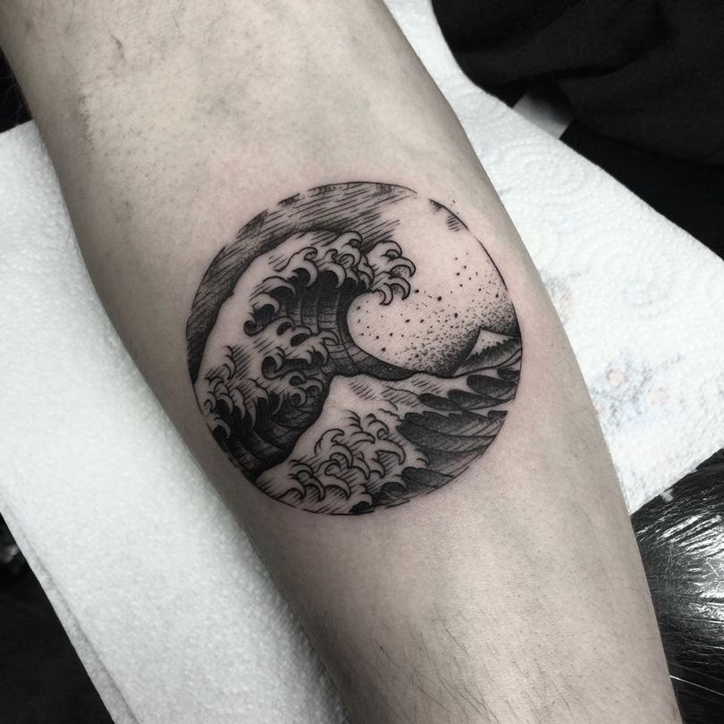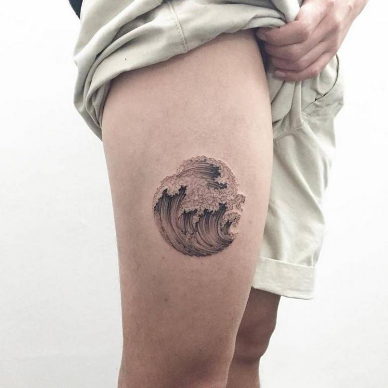 Une énorme vague à la forme arrondie (caractéristique du style japonais). Ces tatouages sont généralement limités à la forme d'un cercle. Ces images sont un symbole d'activité, de tempête et de détermination.