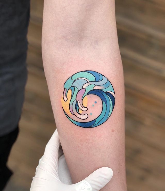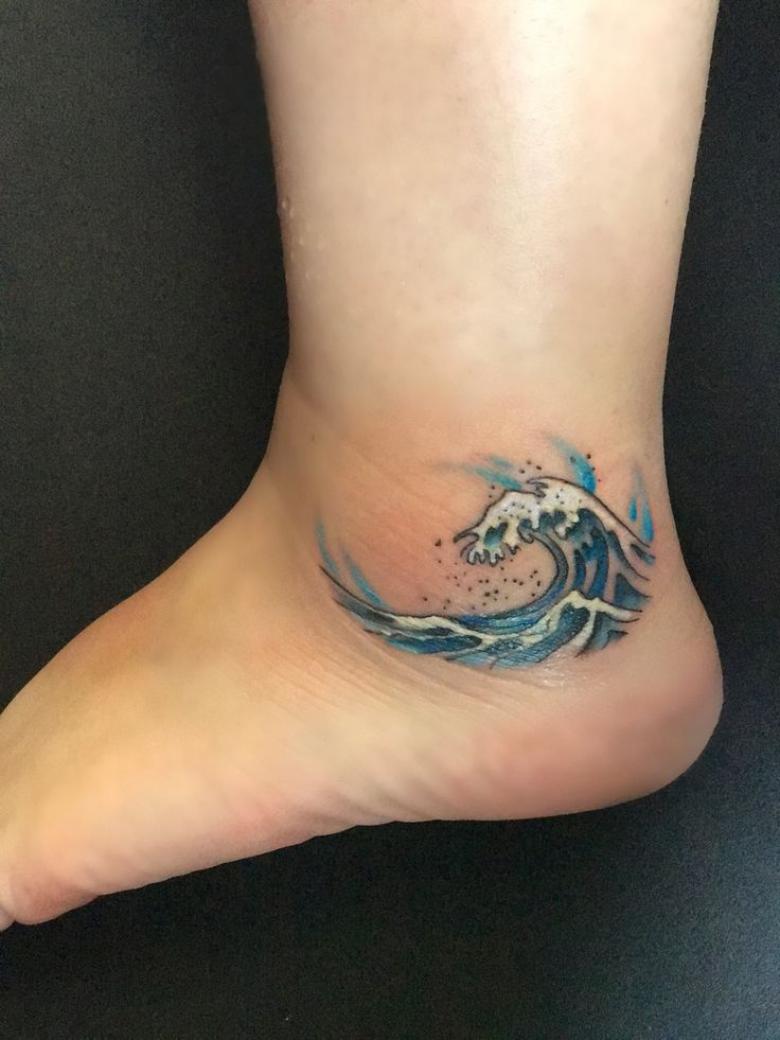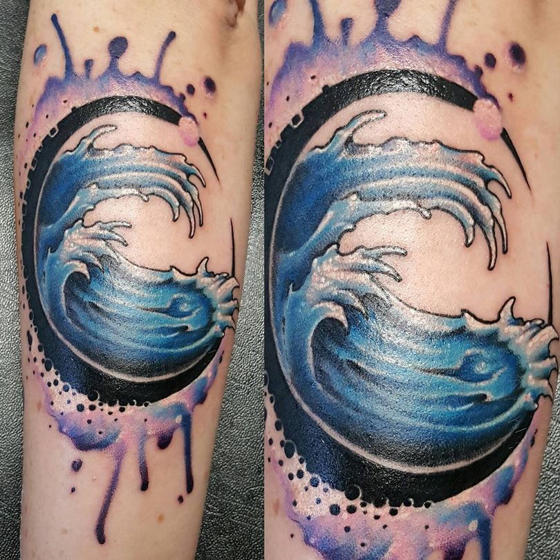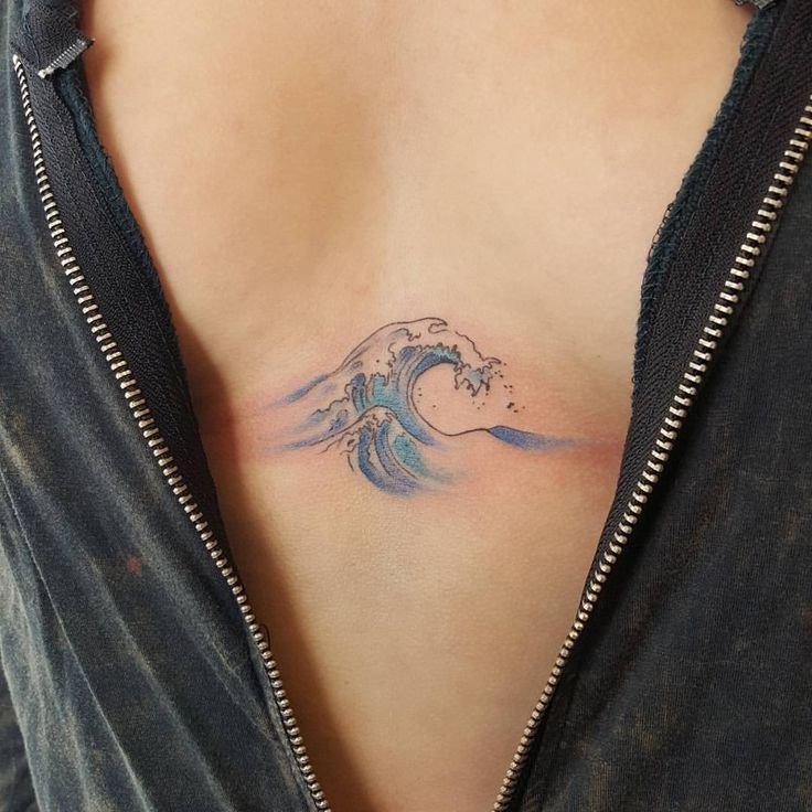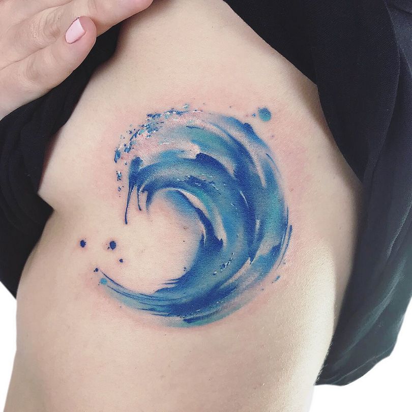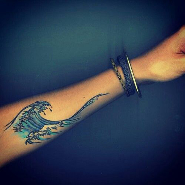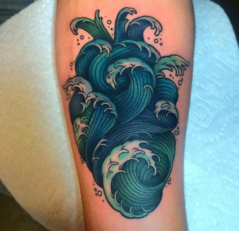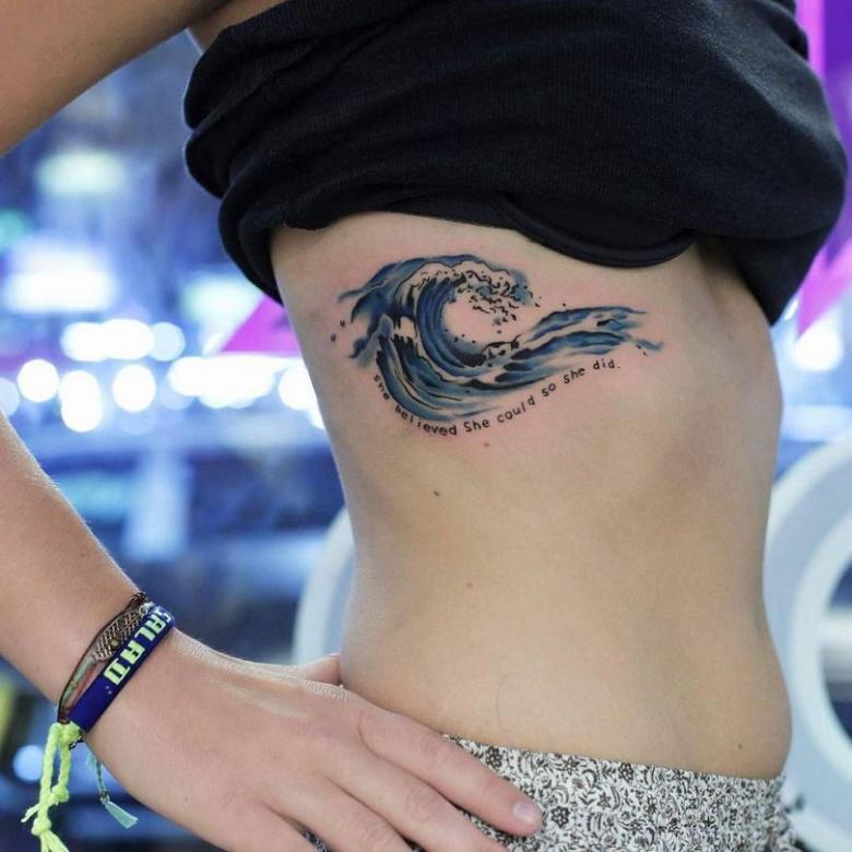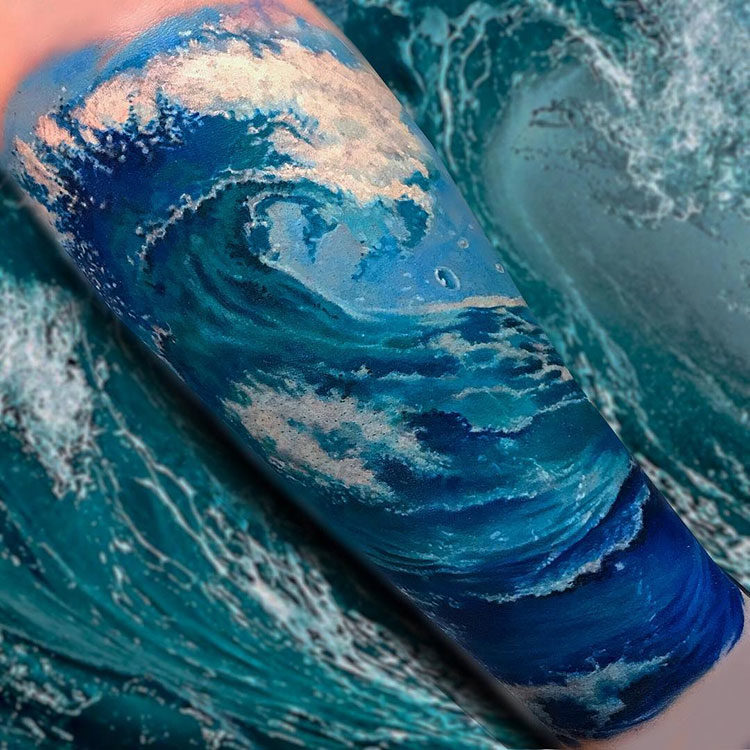 Un motif particulièrement coloré est créé en appliquant du bleu, de l'azur et du blanc.Les motifs de vagues sont tatoués sur les omoplates, les épaules, les poignets et d'autres parties du corps. Les ondulations sur l'abdomen ou les cuisses sont originales. Ces tatouages sont généralement remplis de filles.