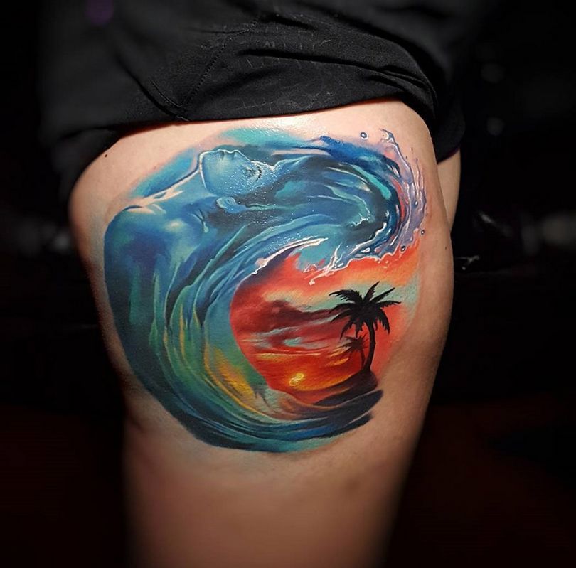 Le beau sexe illustre souvent de manière frappante la vague, dont il change les nuances. L'élément principal est généralement représenté sur un fond d'horizon, de ciel ou de sable. Ces tatouages sont populaires auprès des filles qui aiment voyager.
