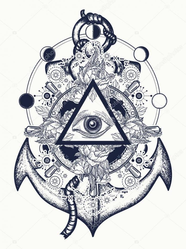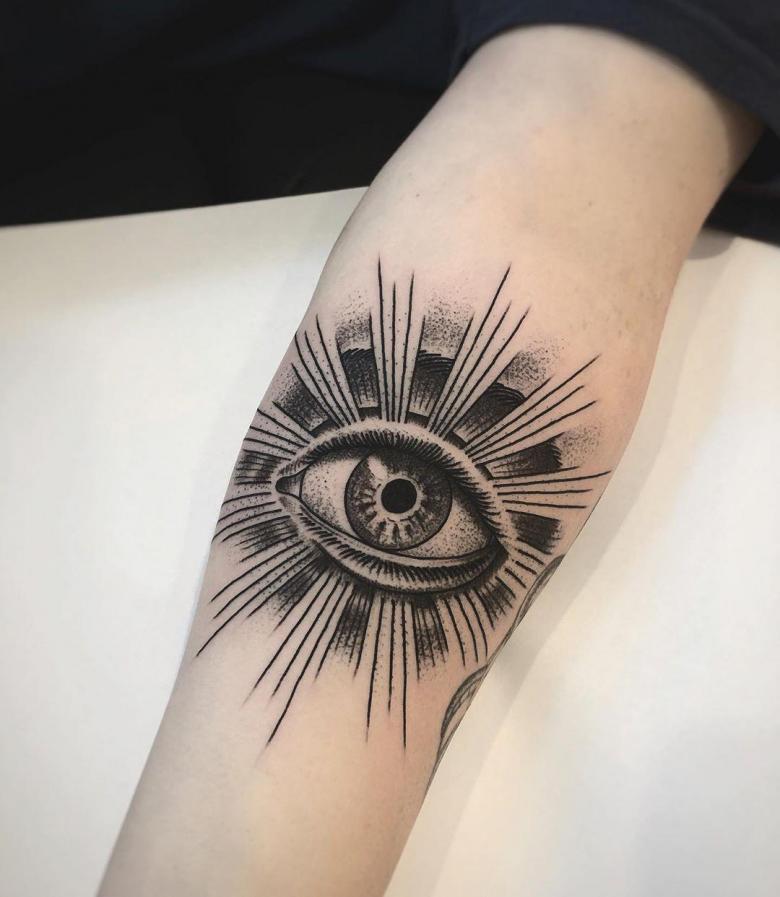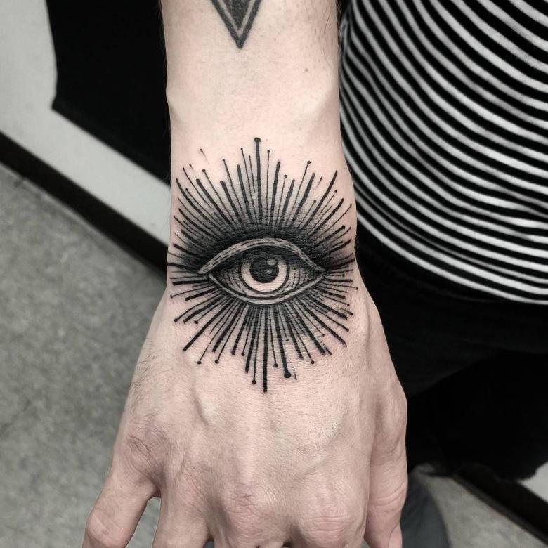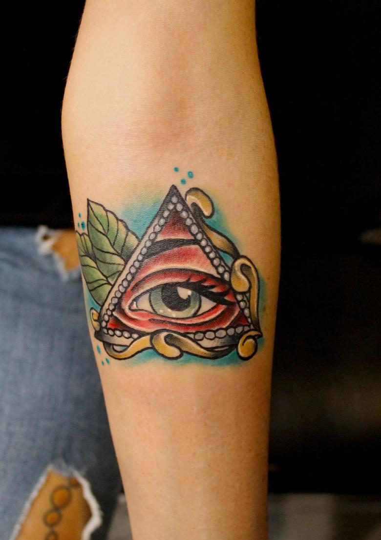 Le symbole est interprété jusque dans la religion. Par exemple, le christianisme interprète l'œil lui-même comme l'œil de Dieu et les facettes du triangle signifient la Sainte Trinité. La signification du tatouage de l'œil dans ce cas est que Dieu est toujours là et évalue chaque action. Pour plus de solennité, ajoutez des rayons de lumière, des nuages flottants ou simplement des couleurs.