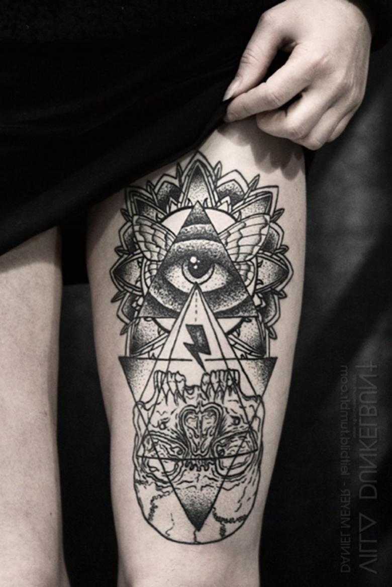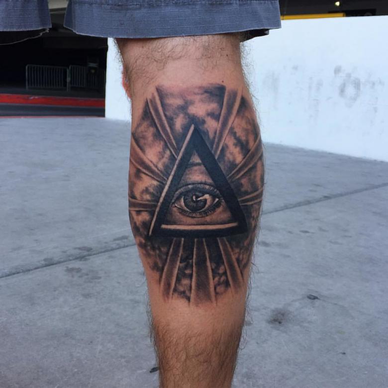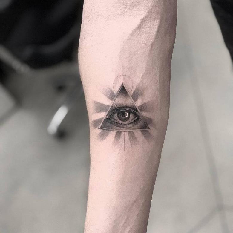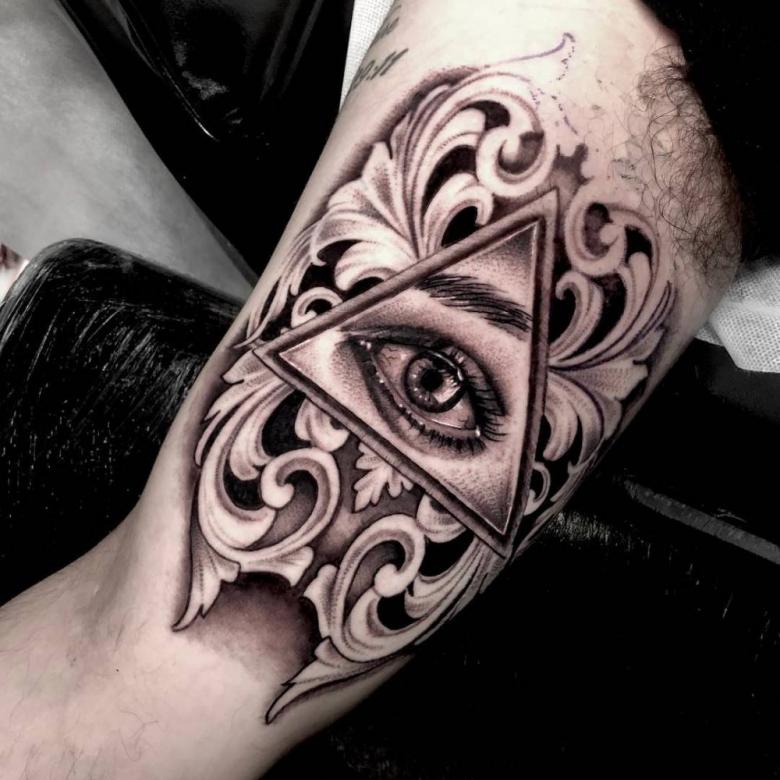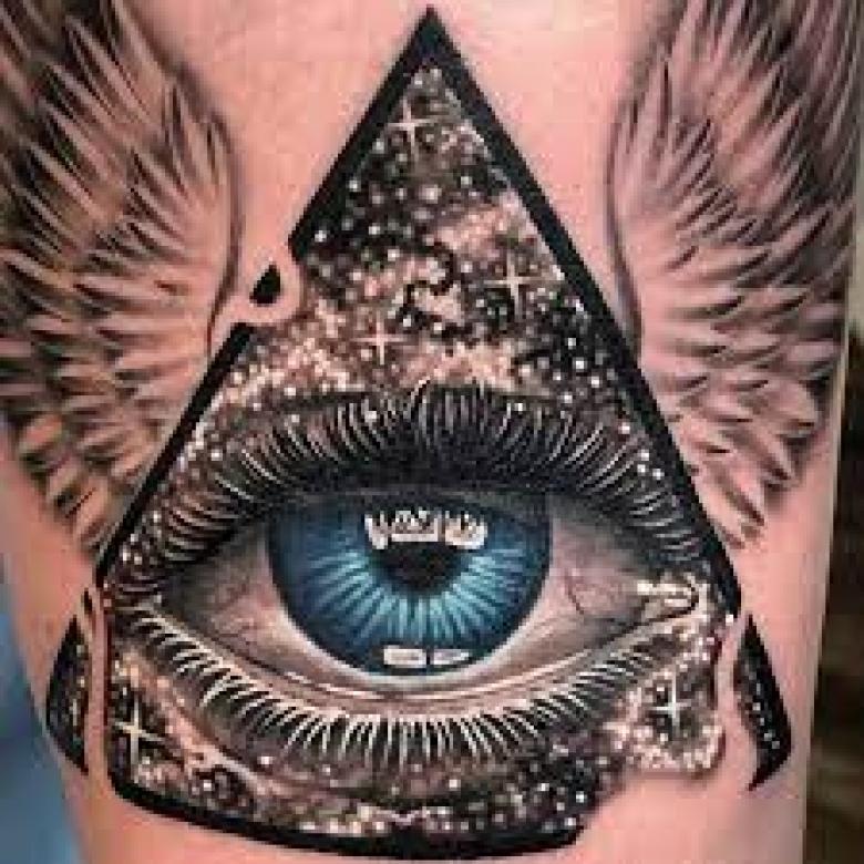Le propriétaire du tatouage All-Seeing Eye dans le triangle a le contrôle de sa vie et même du bien-être du monde. Pour les hommes, un tatouage de style biomécanique est plus approprié.