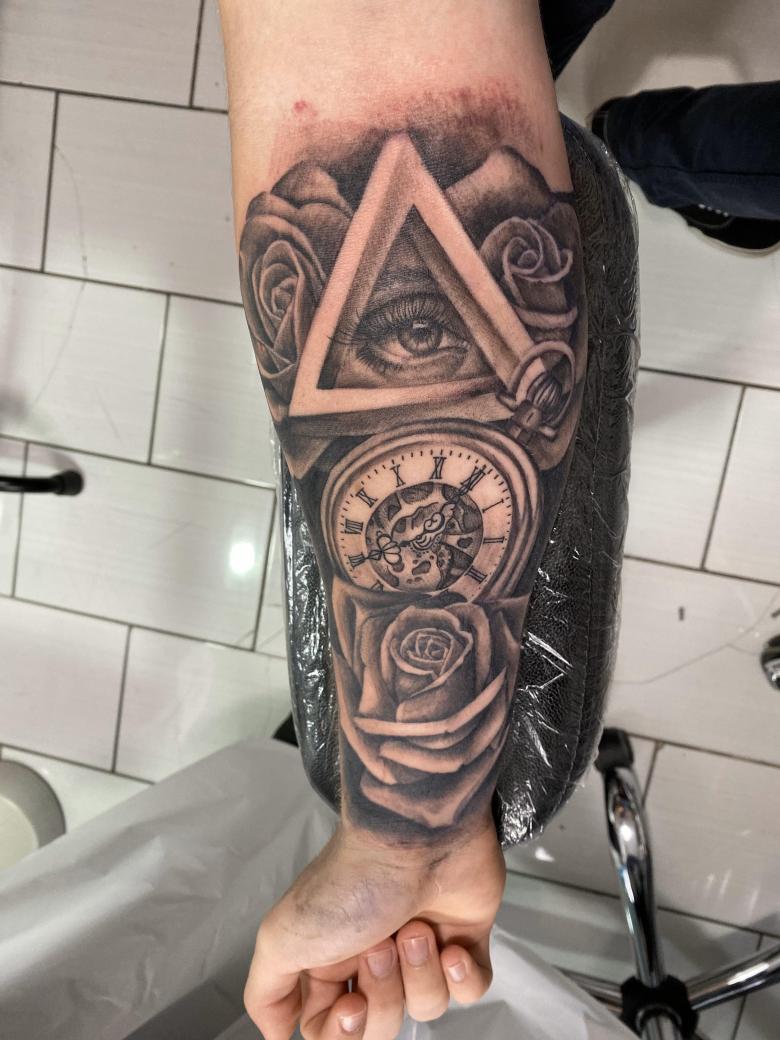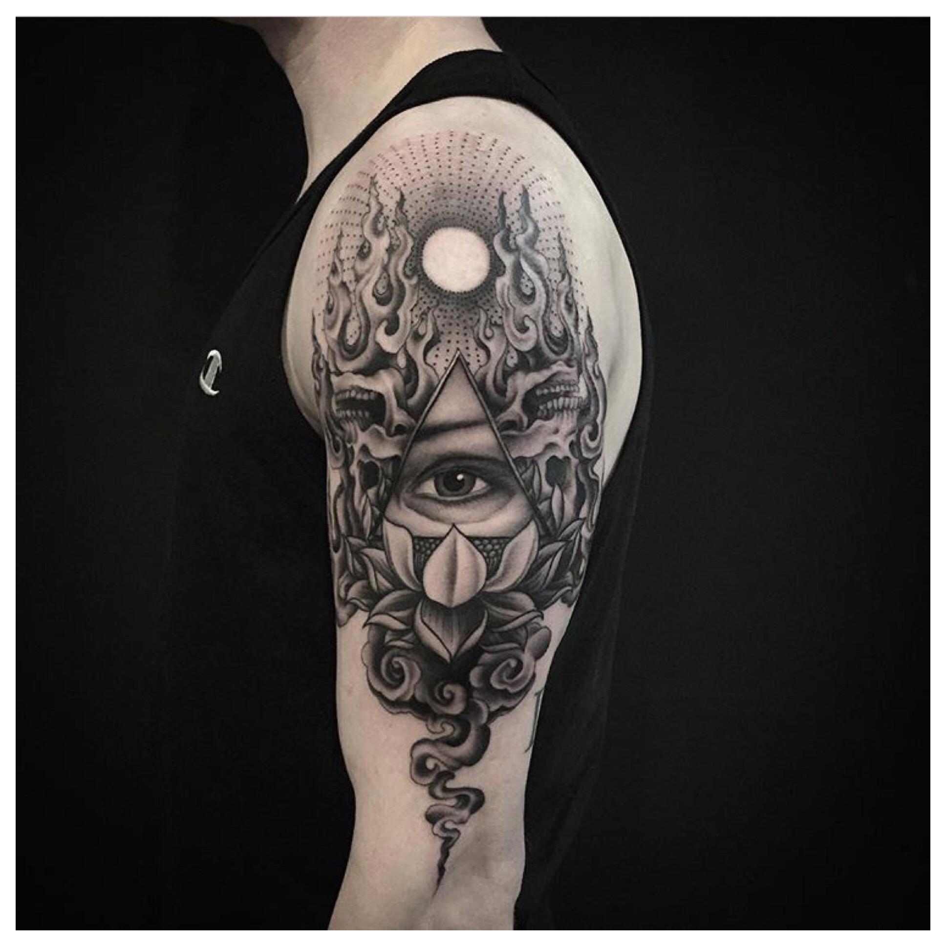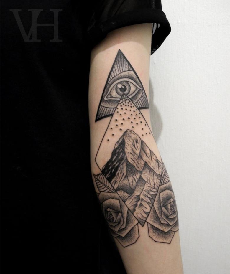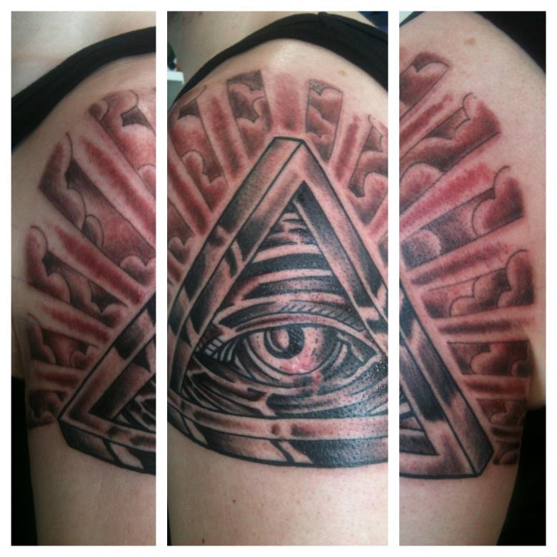 Le propriétaire du tatouage All-Seeing Eye dans le triangle a le contrôle de sa vie et même du bien-être du monde. Pour les hommes, un tatouage de style biomécanique est plus approprié.
