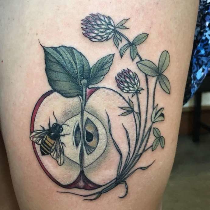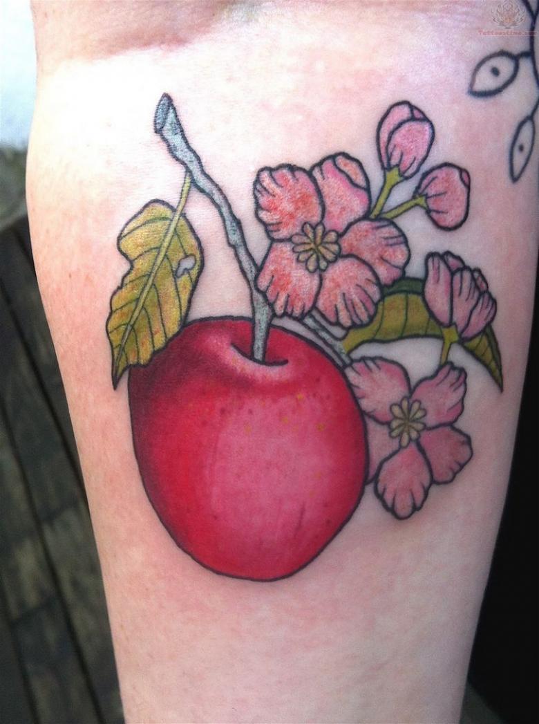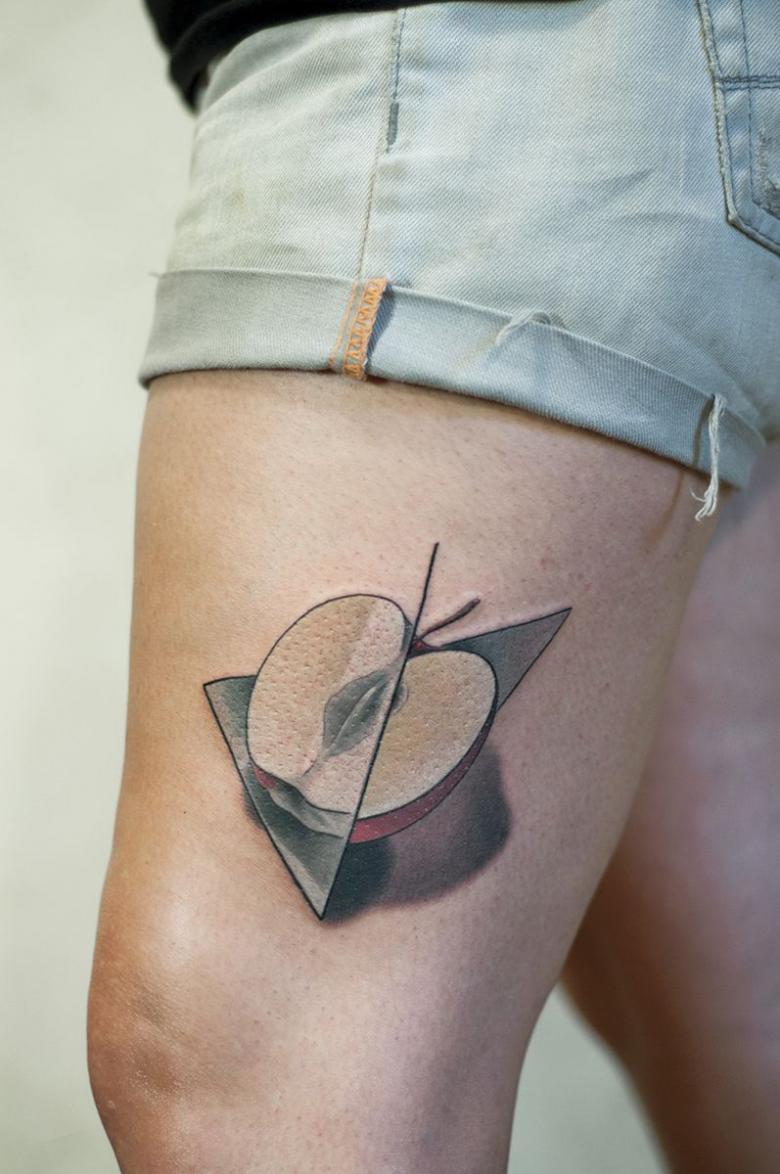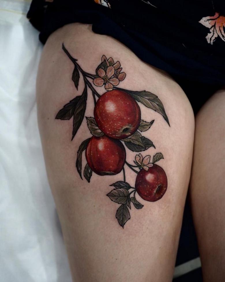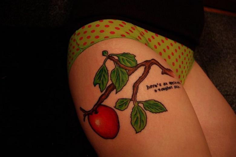 La pomme d'une fille est un tatouage moderne, accrocheur et réaliste. Un superbe tatouage représentant une pomme juteuse et mûre sur le corps d'une fille peut signifier le désir de donner naissance à un bébé, une bonne santé et la recherche du véritable amour.