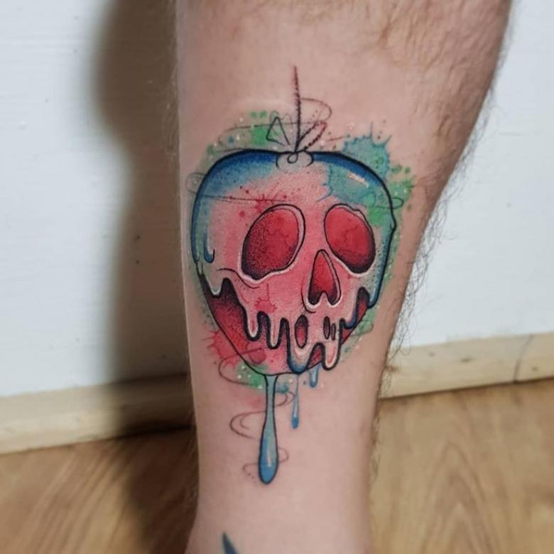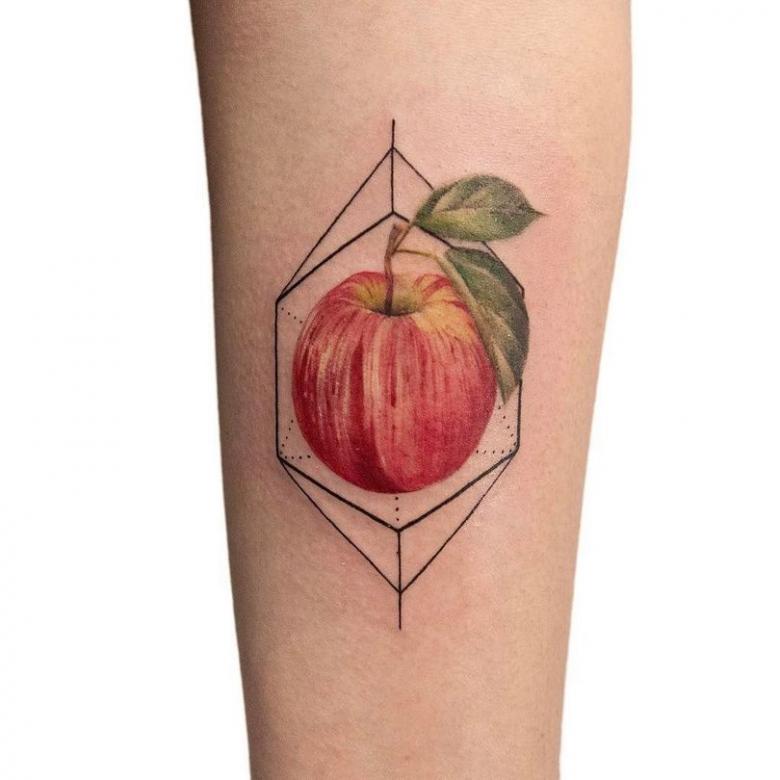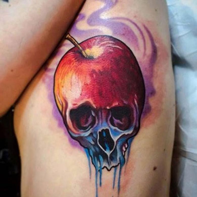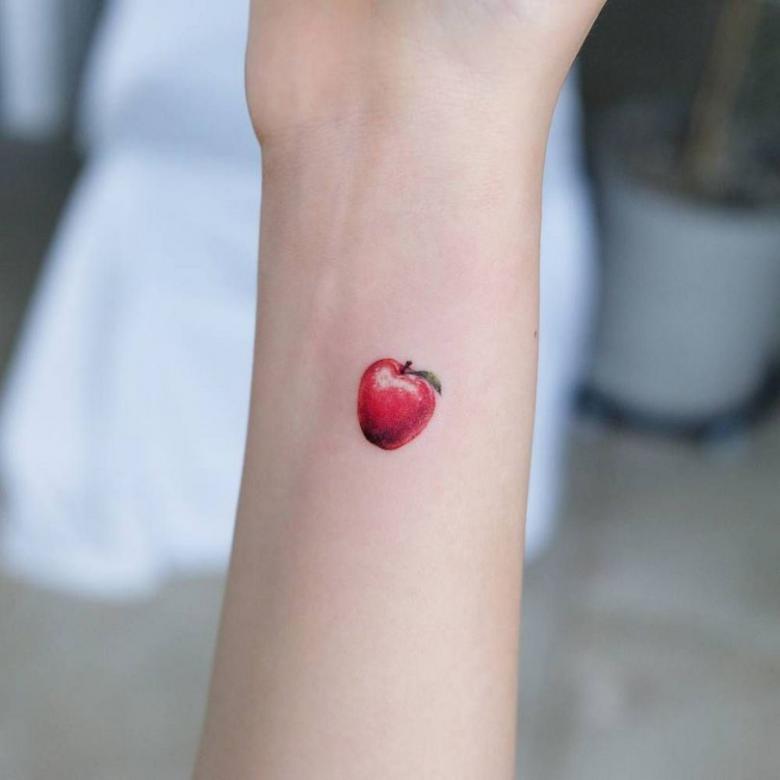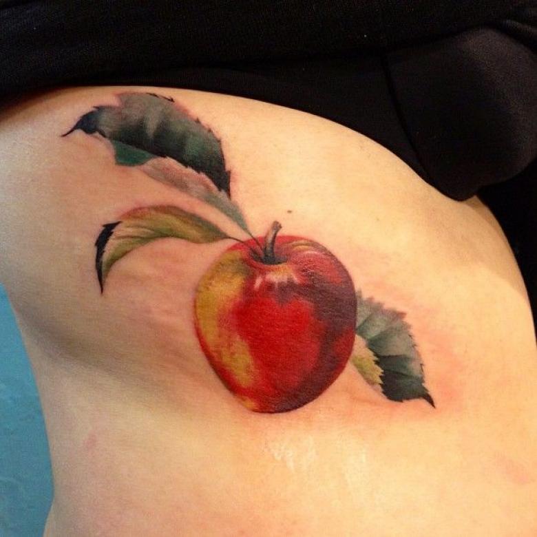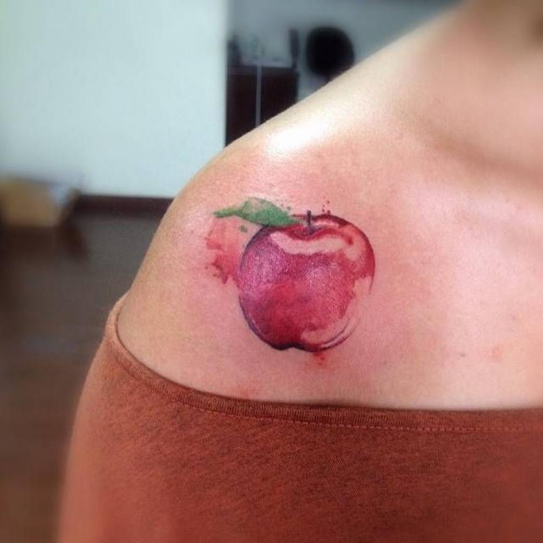 Les femmes du beau sexe commandent souvent le tatouage de la pomme dans un style aquarelle. Il peut signifier une attitude positive envers la communication, l'espoir d'un amour romantique et le désir de prospérité et de joie.