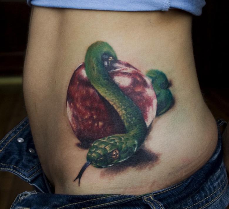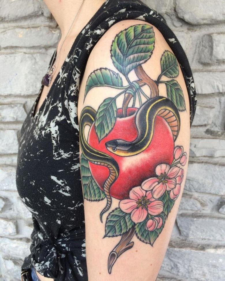 Lorsqu'ils travaillent sur un croquis pour un futur tatouage d'une pomme, les gars choisissent souvent un thème biblique avec le serpent. Une pomme rouge enroulée autour d'un serpent ne peut symboliser qu'une seule chose : le péché causé par la ruse et l'astuce. Ce type veut manifestement laisser sur son corps un souvenir de l'influence négative d'une femme sur sa vie, qui l'a conduit à un désastre émotionnel.