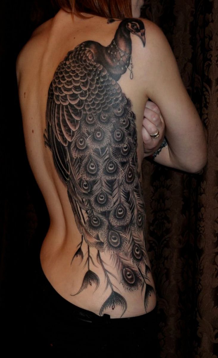 Une silhouette volumineuse et massive aux détails de qualité apparaîtra dans le dos. Vous pouvez y appliquer toute l'imagination et les idées du client mélangées à l'expérience habile du maître dans le studio. Le tatouage sur l'abdomen et les omoplates, souvent observé sur le sexe féminin, est spectaculaire.