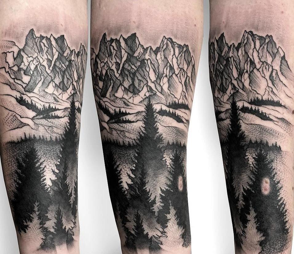 Un autre avantage des tatouages de paysage est qu'ils peuvent être réalisés dans n'importe quel style. Disons minimalisme, travail au trait, réalisme, hyperréalisme, style traditionnel.