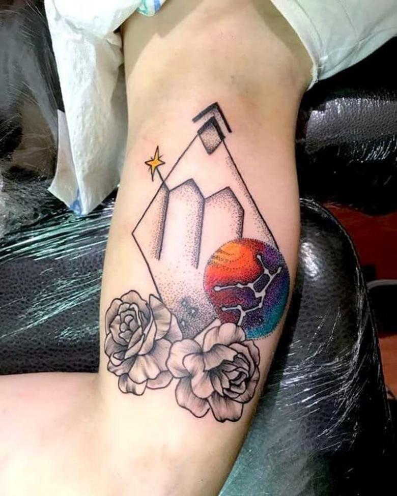 Sur le biceps droit, le tatouage Vierge oriente le porteur vers la création, multipliant les succès créatifs.