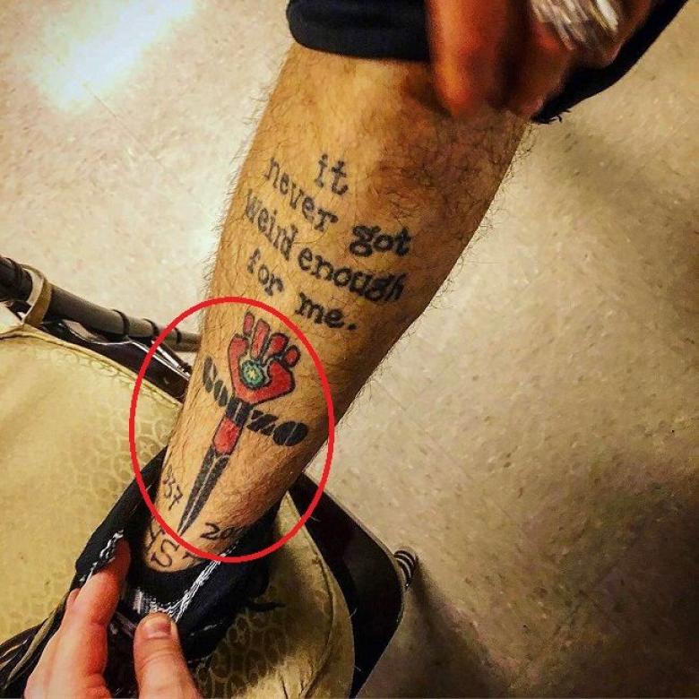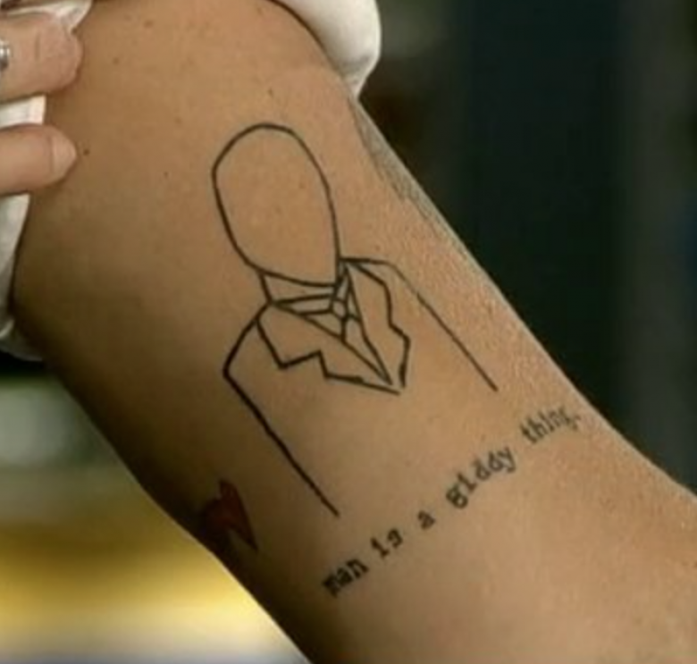 Le tatouage montre un petit homme sans visage, mais portant des vêtements. En dessous, il est écrit que les humains sont des créatures frivoles.