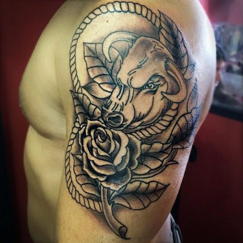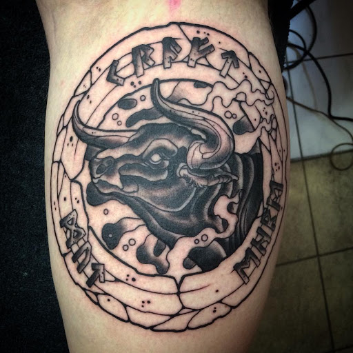 Si un tatouage Taureau est représenté par le croquis d'un animal féroce, cela signifie que le porteur a une personnalité dure et explosive. Malgré cela, une telle personne a la force et le courage de déplacer des montagnes.