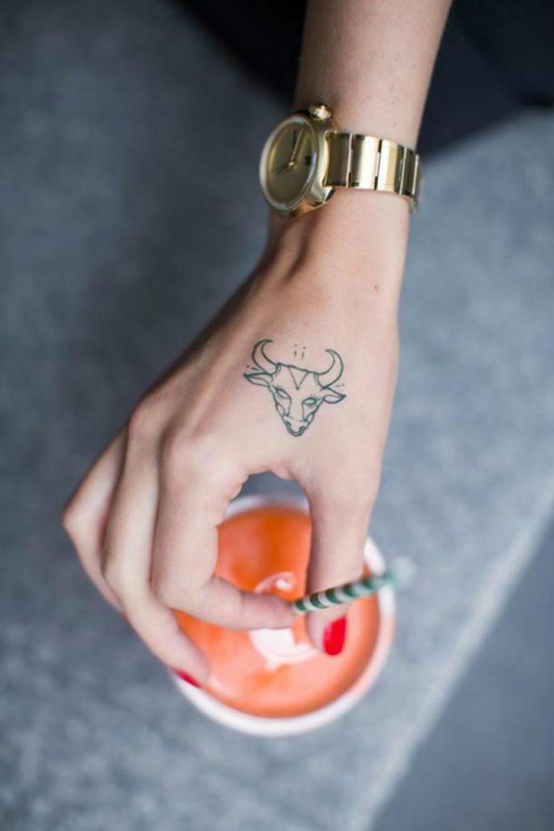 Dessin populairement utilisé sous forme de cercle avec cornes. Il représente le symbole astrologique de ce signe du zodiaque. Ce tatouage du signe du Taureau sur la main convient à ceux qui recherchent la simplicité et le minimalisme. Une telle image est intéressante entre l'index et le pouce.