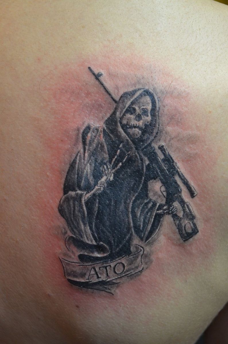 Le maître, procédant au travail, passe préalablement avec le client une conversation introductive, ce qui est exactement prévu de frapper, combien d'éléments entreront dans le dessin, quelles décisions de couleur il est préférable d'appliquer, et comme la place du dessin de tatouage militaire est définie.