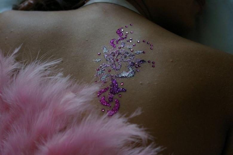 La technique du tatouage pailleté est simple : la colle hypoallergénique est appliquée sur la peau à l'aide d'un pinceau, recouverte de petites paillettes colorées, puis l'excédent est secoué. Une image colorée et chatoyante avec des bords clairs apparaît sur le corps.
