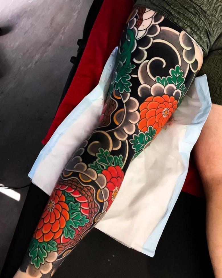 Grâce à une technique de remplissage spéciale, vous pouvez obtenir une forte luminosité des bords sur fond de tonalité atténuée de la partie centrale. Le coût des tatouages japonais est assez élevé, car le maître travaille sur le tatouage pendant plus d'une journée.
