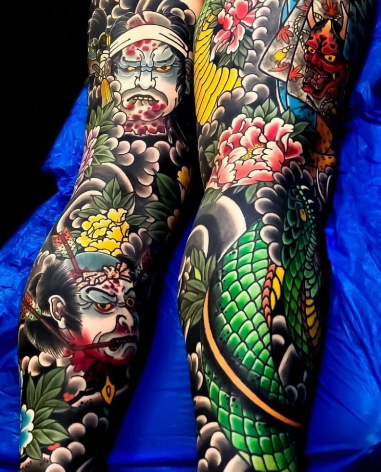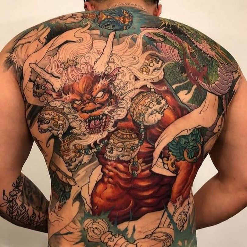 Parmi le panthéon des personnages mythiques, les Japonais privilégient les démons Oni, héros des épopées nationales. Les créatures à cornes des contes de fées ont un aspect effrayant, la cruauté particulière des images donne à la peau multicolore sur fond de grimaces intimidantes. La croyance japonaise veut que les personnes mal intentionnées se transforment en démons maléfiques, mais un tatouage de ce type est considéré comme un talisman qui confère une force physique à son porteur.