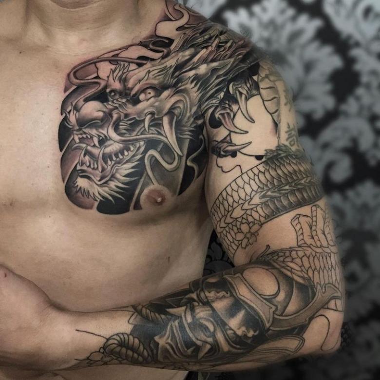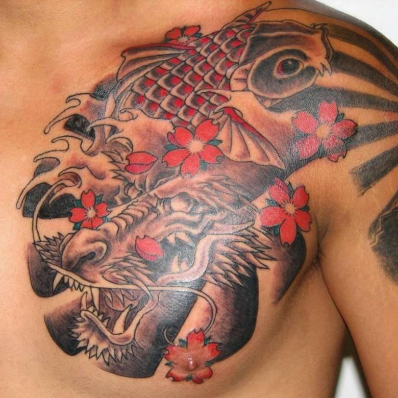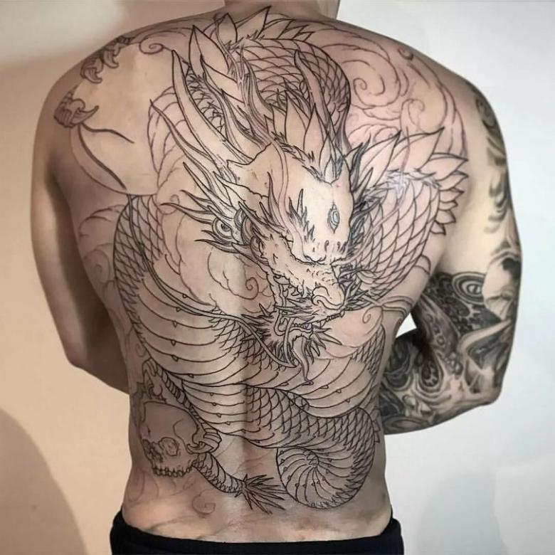 Dans la mythologie japonaise, ainsi que dans la mythologie chinoise, une place spéciale est accordée aux dragons, de sorte que les croquis avec cette créature mythique choisissent les amateurs de tatouage des deux sexes. Pour les hommes, le tatouage de dragon est un symbole de puissance et d'autorité, un pouvoir masculin extraordinaire. Un dragon, mis en évidence par un contour, est associé à l'énergie ardente du soleil, à la chance et à la longévité. Si le caractère sacré est à trois doigts, c'est un symbole de tutelle du gardien spirituel.