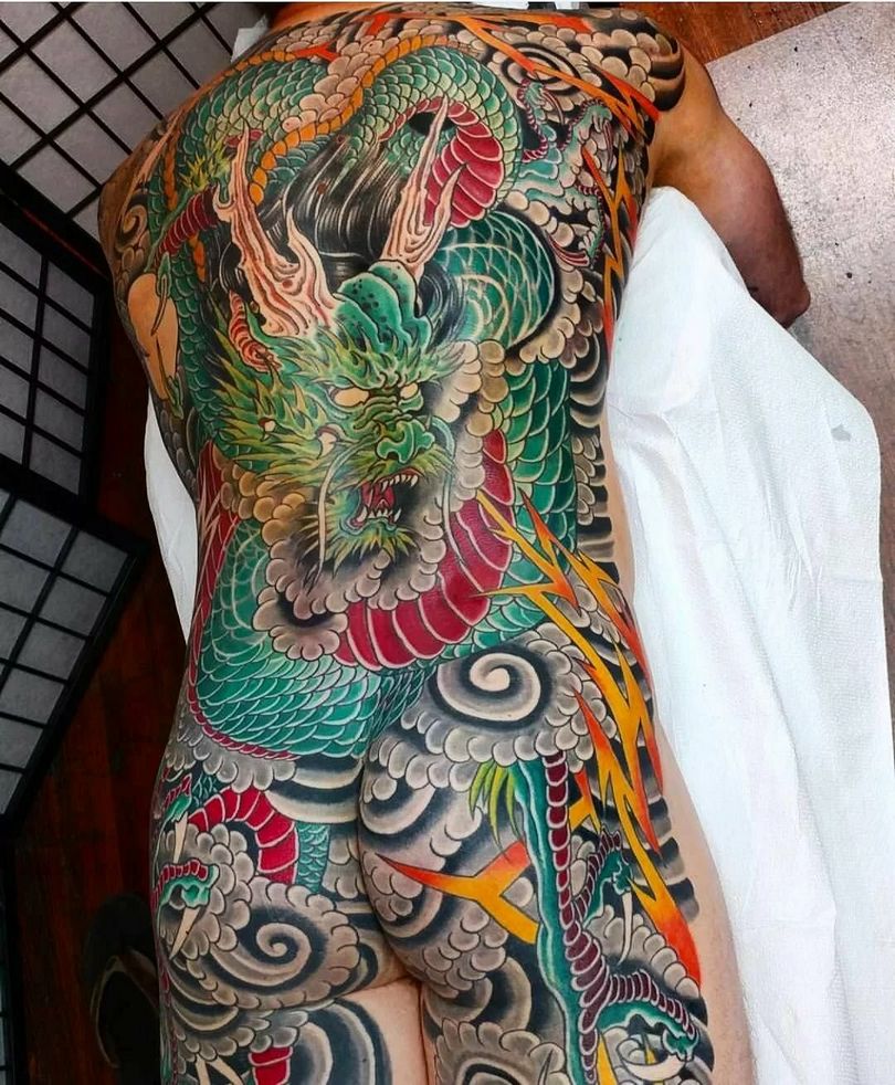 - le style iredzumi était le privilège des yakuzas, avec des peintures à grande échelle couvrant toute la zone du dos avec une transition vers les bras ainsi que les cuisses ;