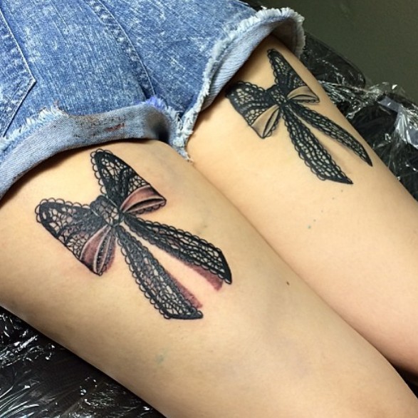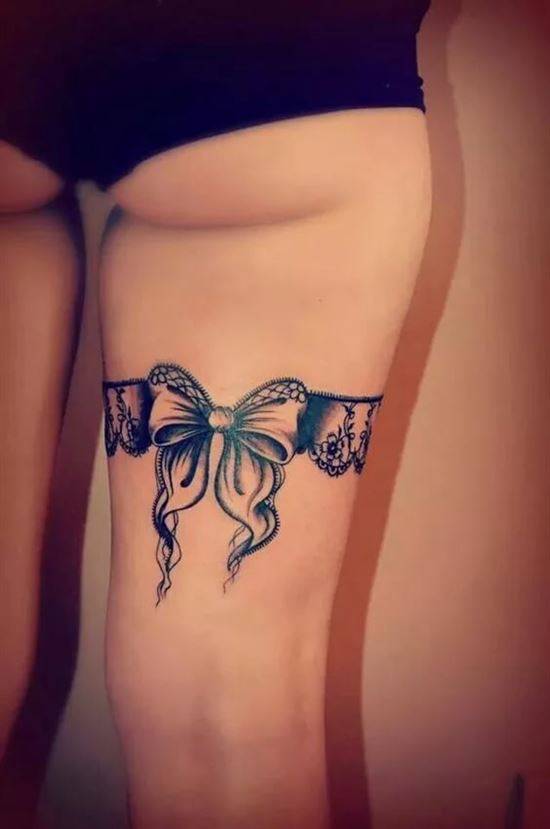 最常见的应用纹身的地方是腿部。该设计被应用于从臀部到脚踝的表面。在脚踝处,蝴蝶结将凸显女孩的优雅和柔弱。唤醒男人的激情和欲望,在臀部描绘一个蝴蝶结的纹身,位置对称,模仿蕾丝吊带。