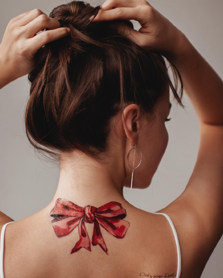 纹身会在女性的身体上保留多年,所以决定将它放在哪里以及你希望它是什么样子很重要。蝴蝶结将强调女孩的女性化和温柔,为画面增添诱惑力和俏皮感。