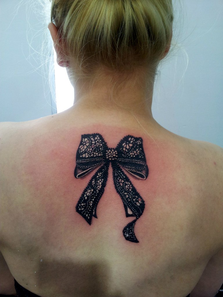 - 位于肩胛骨之间的蝴蝶结在单色和不同颜色中都显得很有趣。这个纹身不会让主人感到厌烦,而且会增加魅力和成熟度。