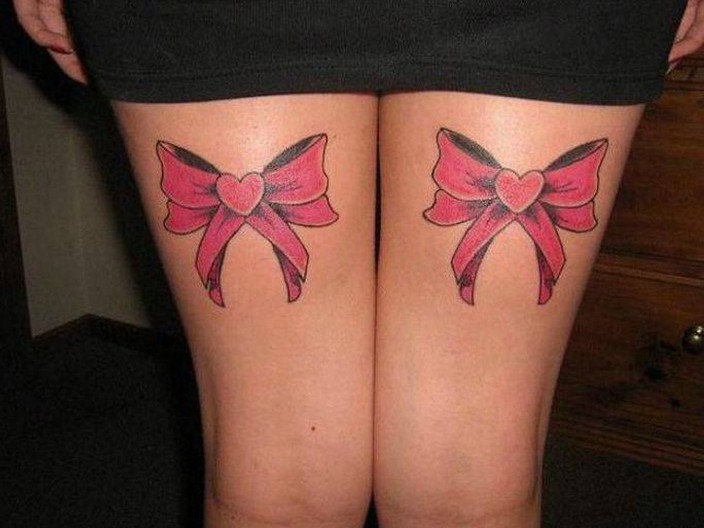 蝴蝶结被认为是美丽和节日精神的象征。它经常出现在衣服、礼品包装、鲜花上。纹身完美地装饰了一个年轻女孩的身体,强调了她的女性魅力。