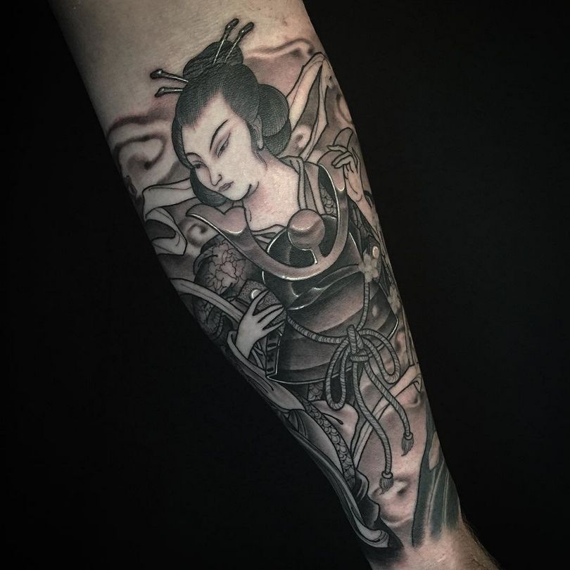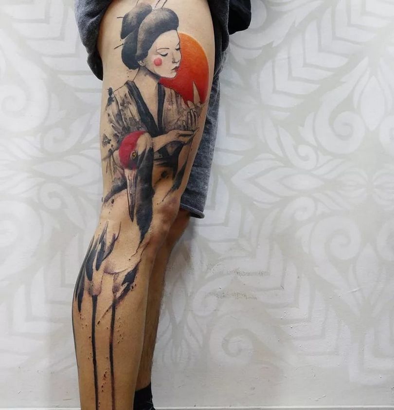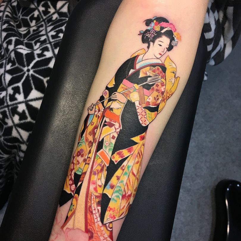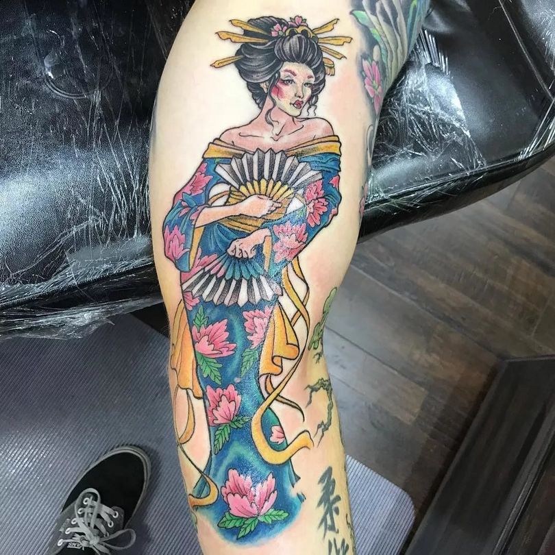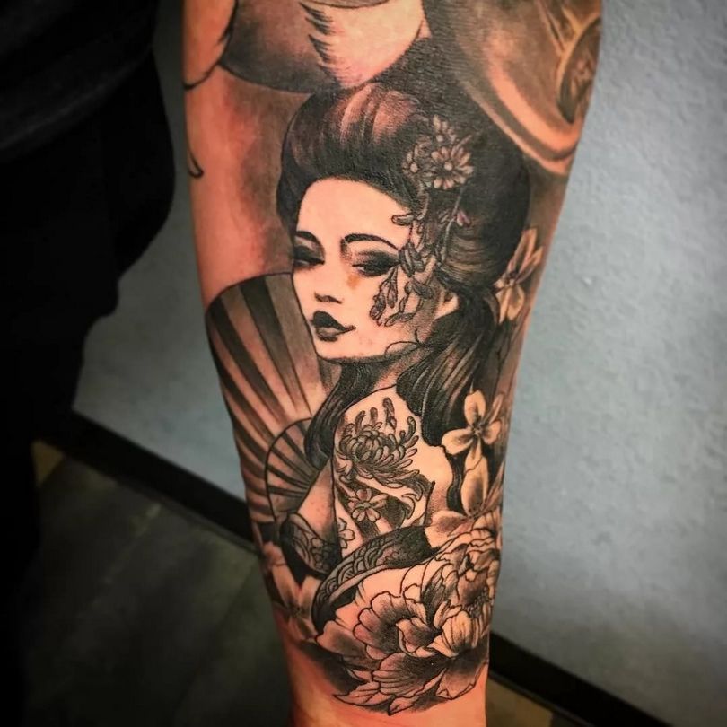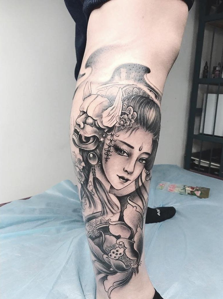 全身的艺妓可以被描绘在前臂或背部。顺便说一下,在小腿上,这个纹身看起来会相当壮观。
