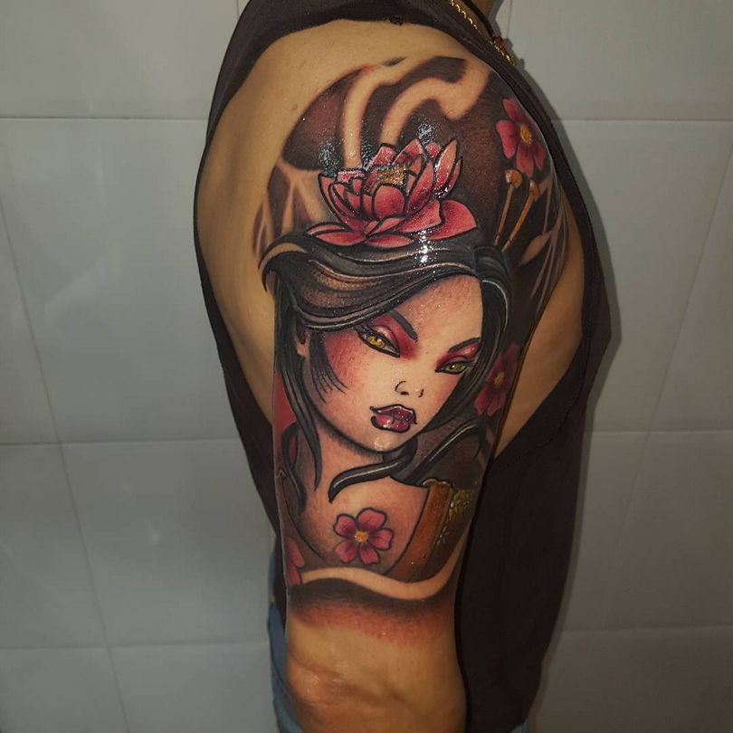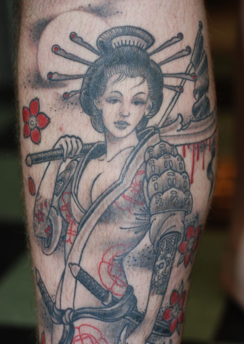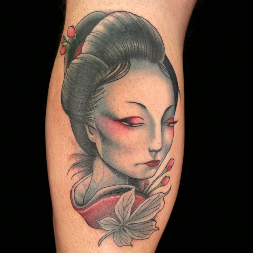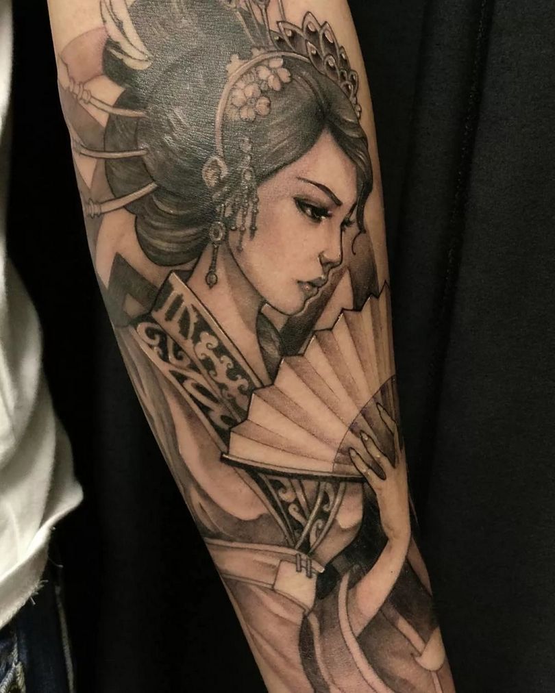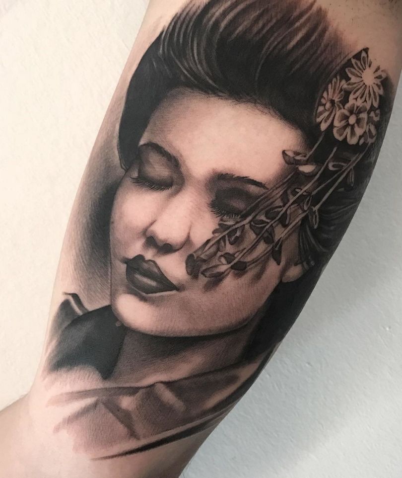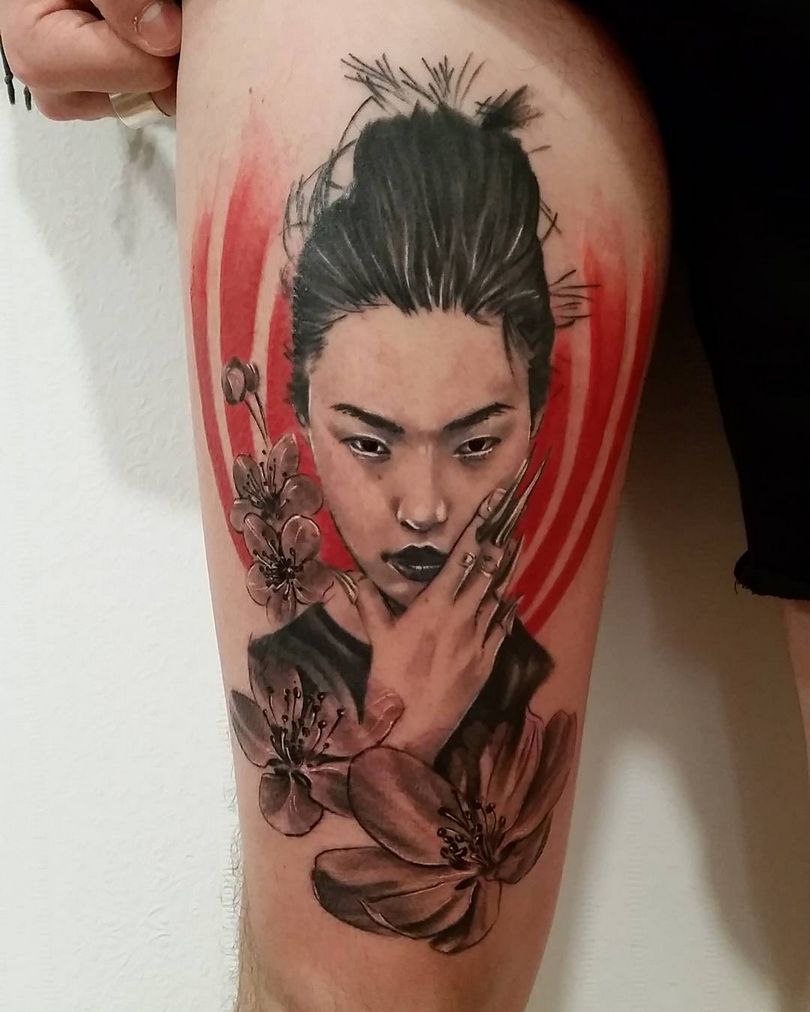 全身的艺妓可以被描绘在前臂或背部。顺便说一下,在小腿上,这个纹身看起来会相当壮观。