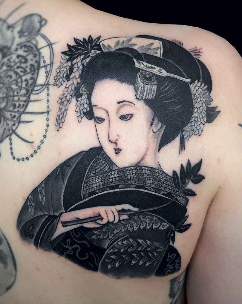 艺妓纹身可以在身体的任何部位进行。为了更具体地了解图像,清楚地追踪细节,许多人选择了背面。在这里,可以用一把扇子或伞来描绘这位诱惑者,只要有足够的空间。