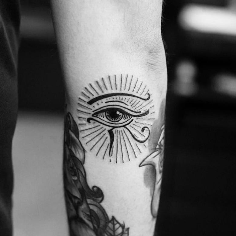 据沙龙的主人说,顾客喜欢小黑或小蓝的单色纹身,以极简主义的风格制作。眼睛本身有时被射线框住,可以刻在太阳圆上,也可以刻在三角形上,而且颜色看起来也不差。