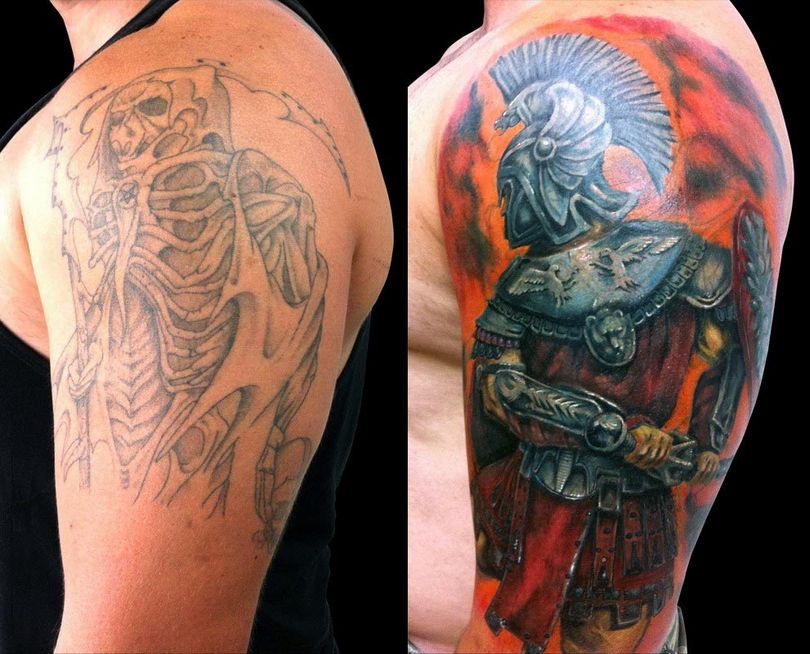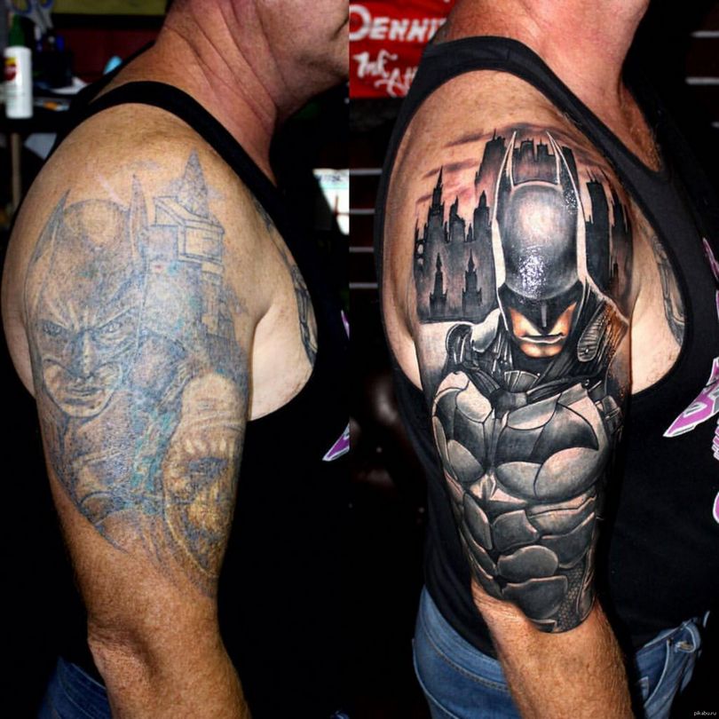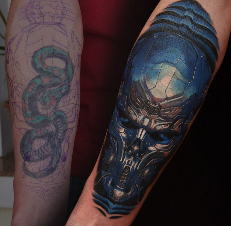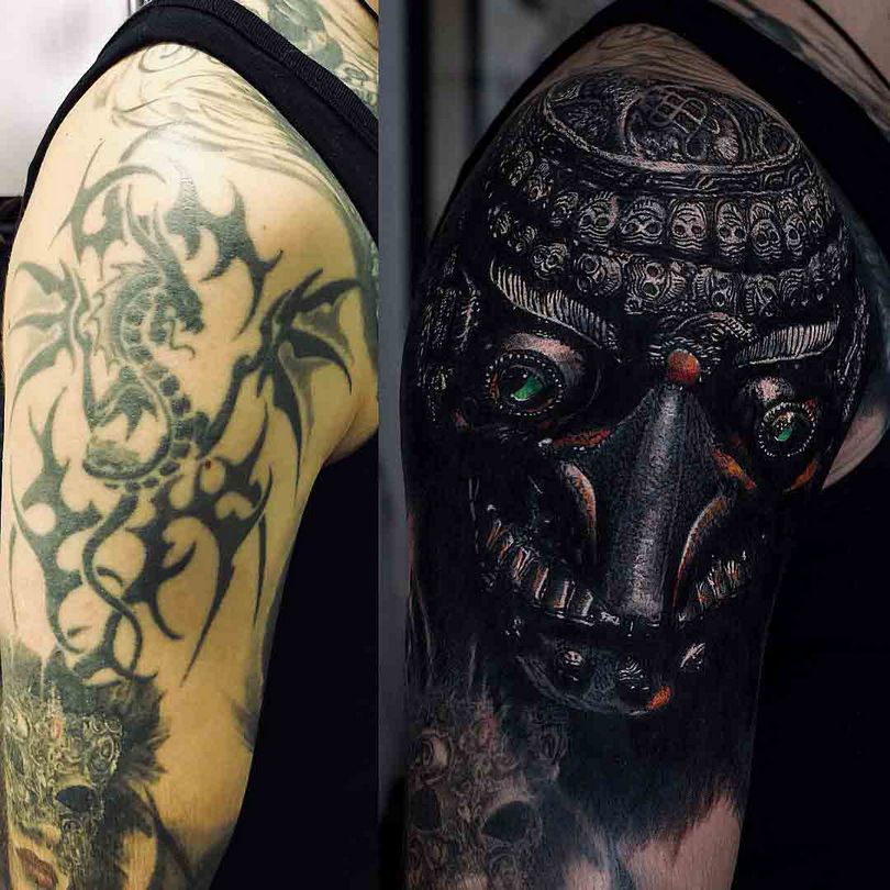不是所有的照片和疤痕都能成功叠加。例如,一个全彩色的套子,很难用新的油漆来掩盖。这就留下了升级的选择,你可以尝试重新制作或刷新现有的模式。但如果目标是去除纯黑色调,成功的可能性不大,它不会被较浅的颜料所取代。这就剩下一个选择--激光皮肤美白,整形手术。