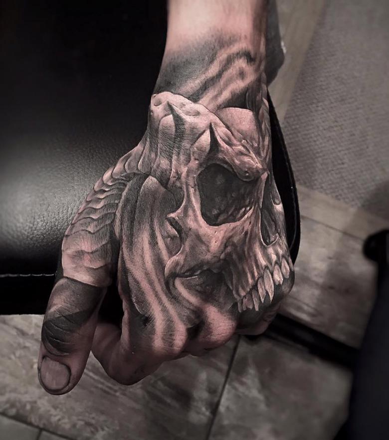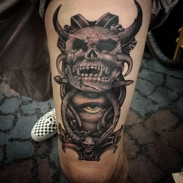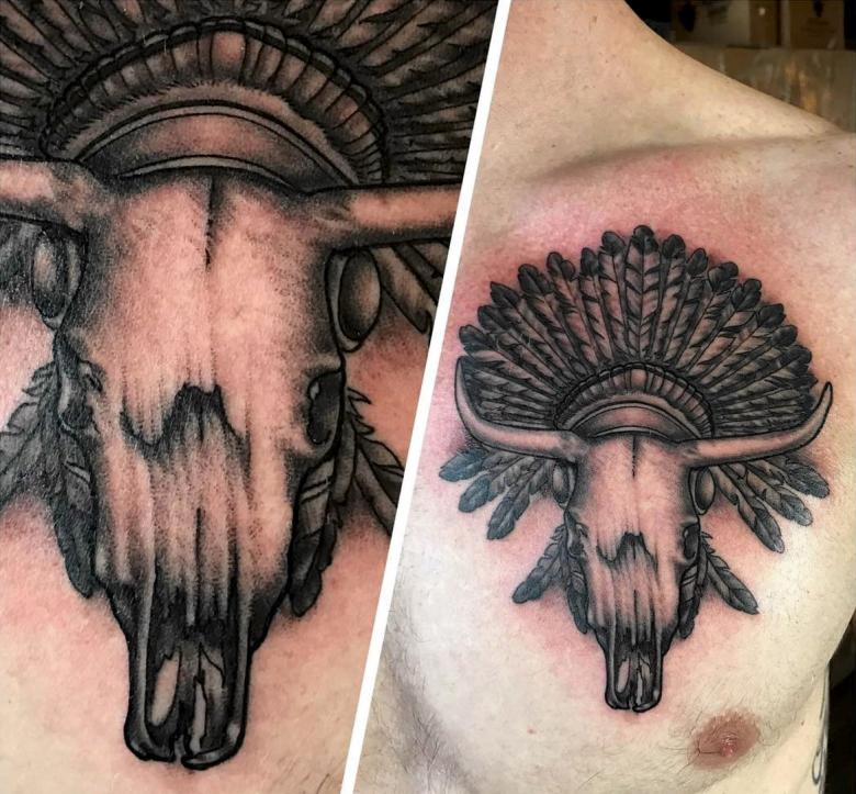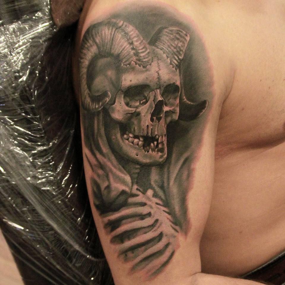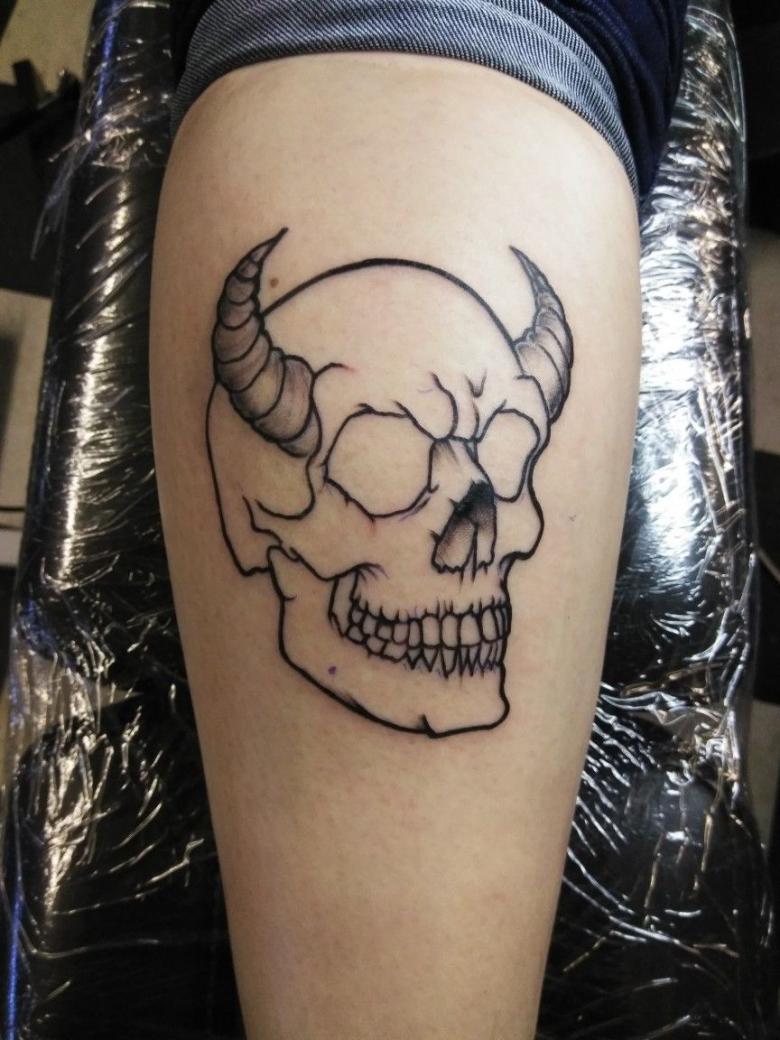 Le tatouage de la tête de mort et des cornes a toujours été considéré comme un symbole de pouvoir, de majesté. Le possesseur potentiel d'un tel dessin pourrait espérer des postes élevés, des projets d'argent dans un avenir très proche. La signification du tatouage de crâne avec cornes est d'attirer le profit.