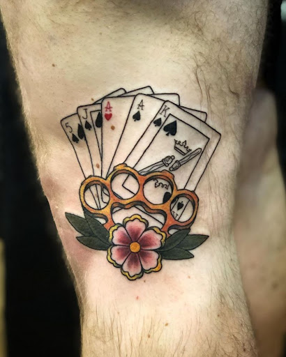 Les prisonniers sont plus susceptibles que les autres personnes d'avoir des tatouages ayant un thème similaire. (lire : Tatouages en prison). Parmi les premiers, on trouve les joueurs et les escrocs. Et ils ne se contentent pas de tatouer une carte à la fois, mais deux ou plus. Ils ne les choisissent pas seulement pour s'amuser, mais sélectionnent une combinaison dans laquelle les gains sont garantis. Cette composition est destinée à porter chance à son propriétaire. Appliquer les cartes de tatouage sur la main qui est impliquée dans le jeu.
