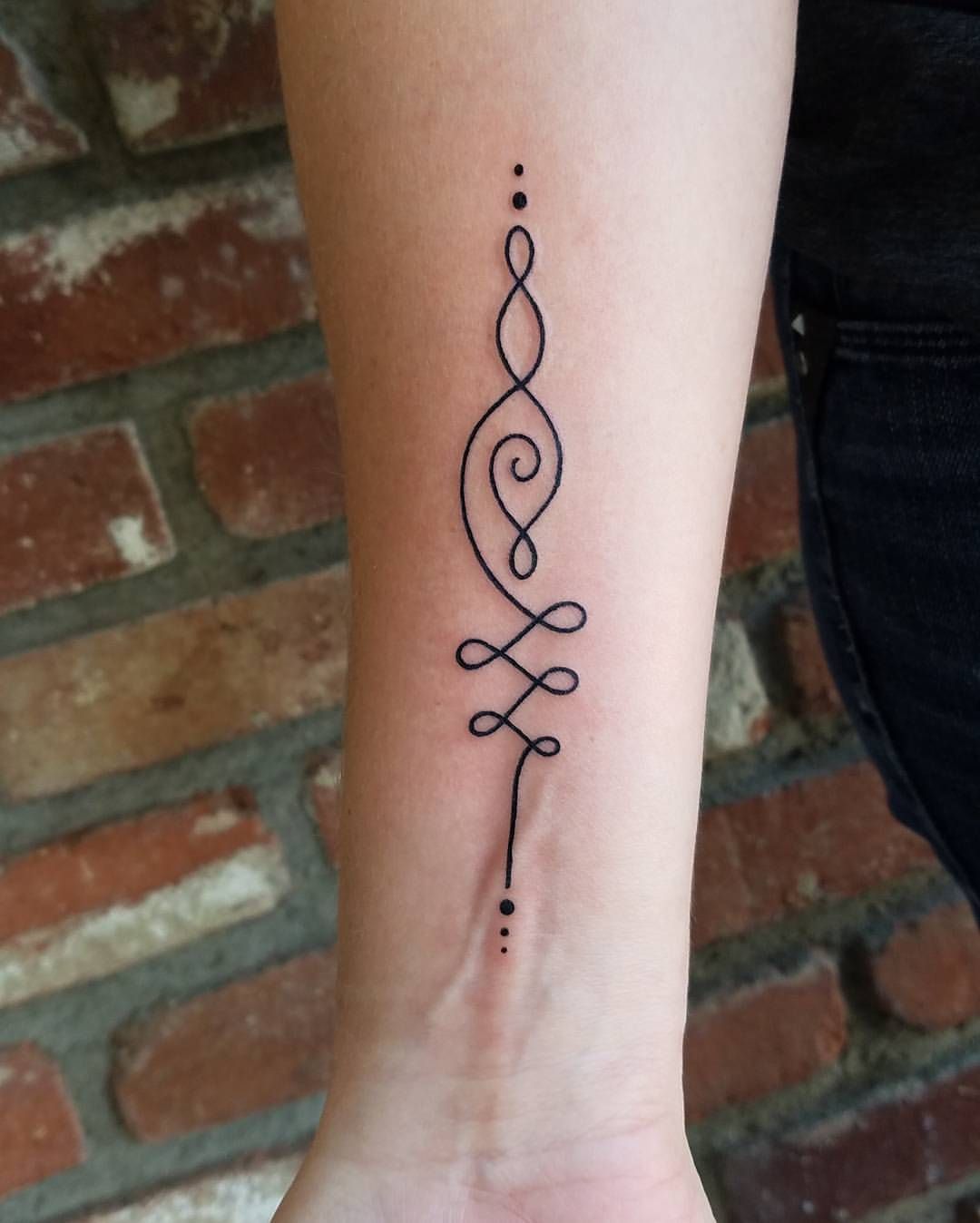 La signification du tatouage Unalome réside dans la difficulté de trouver sa voie vers la sagesse. Le propriétaire de ce motif sur le corps espère surmonter les déficiences, trouver la paix, connaître son âme. Ce n'est qu'alors qu'il y aura une clarté d'esprit.