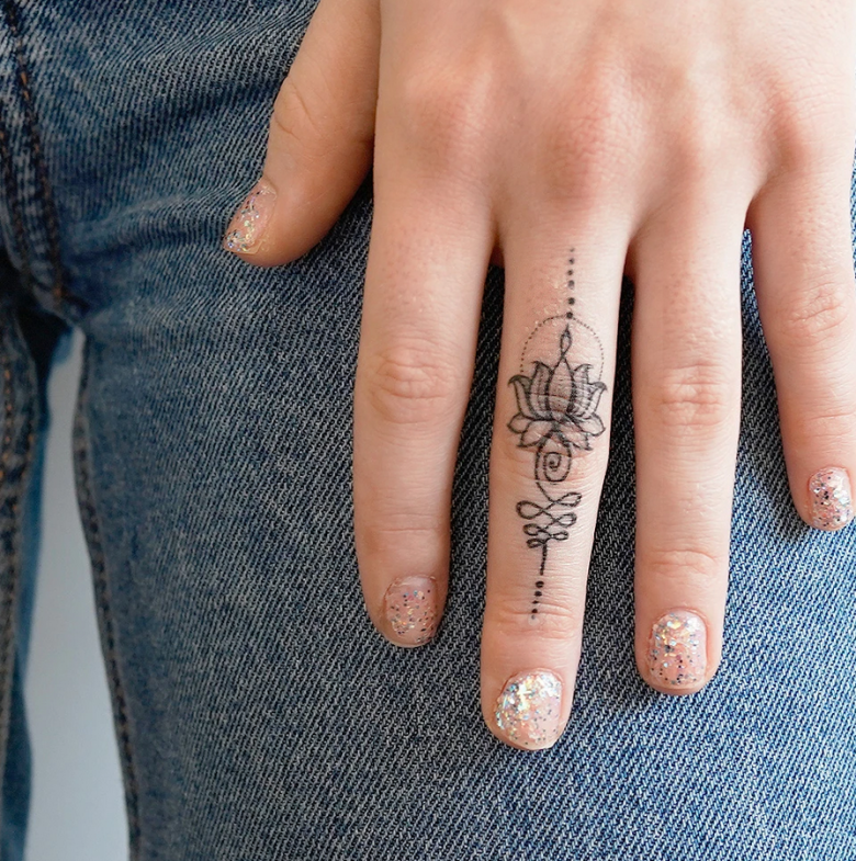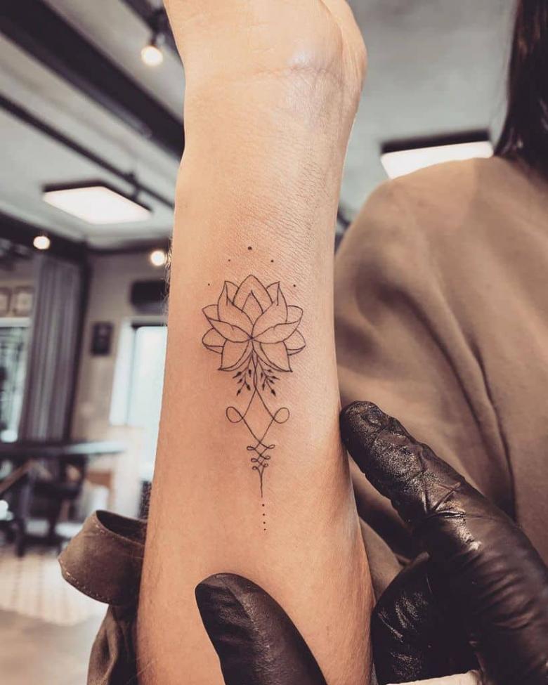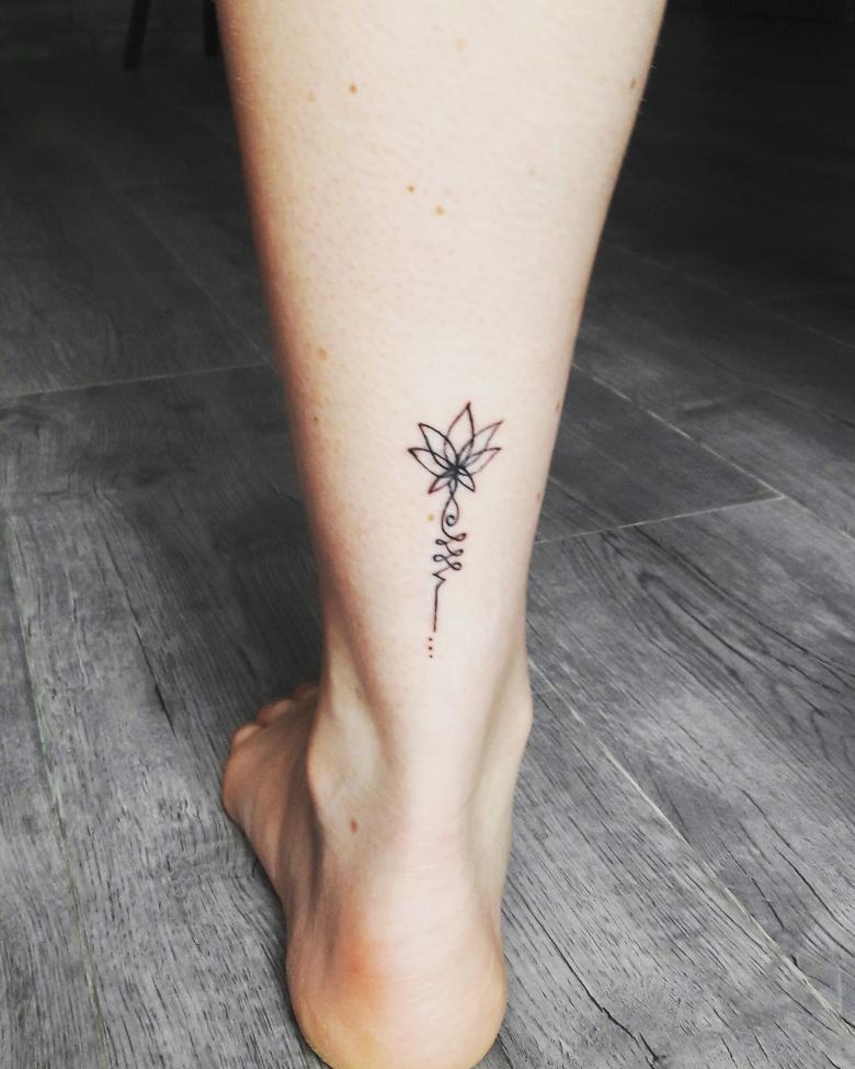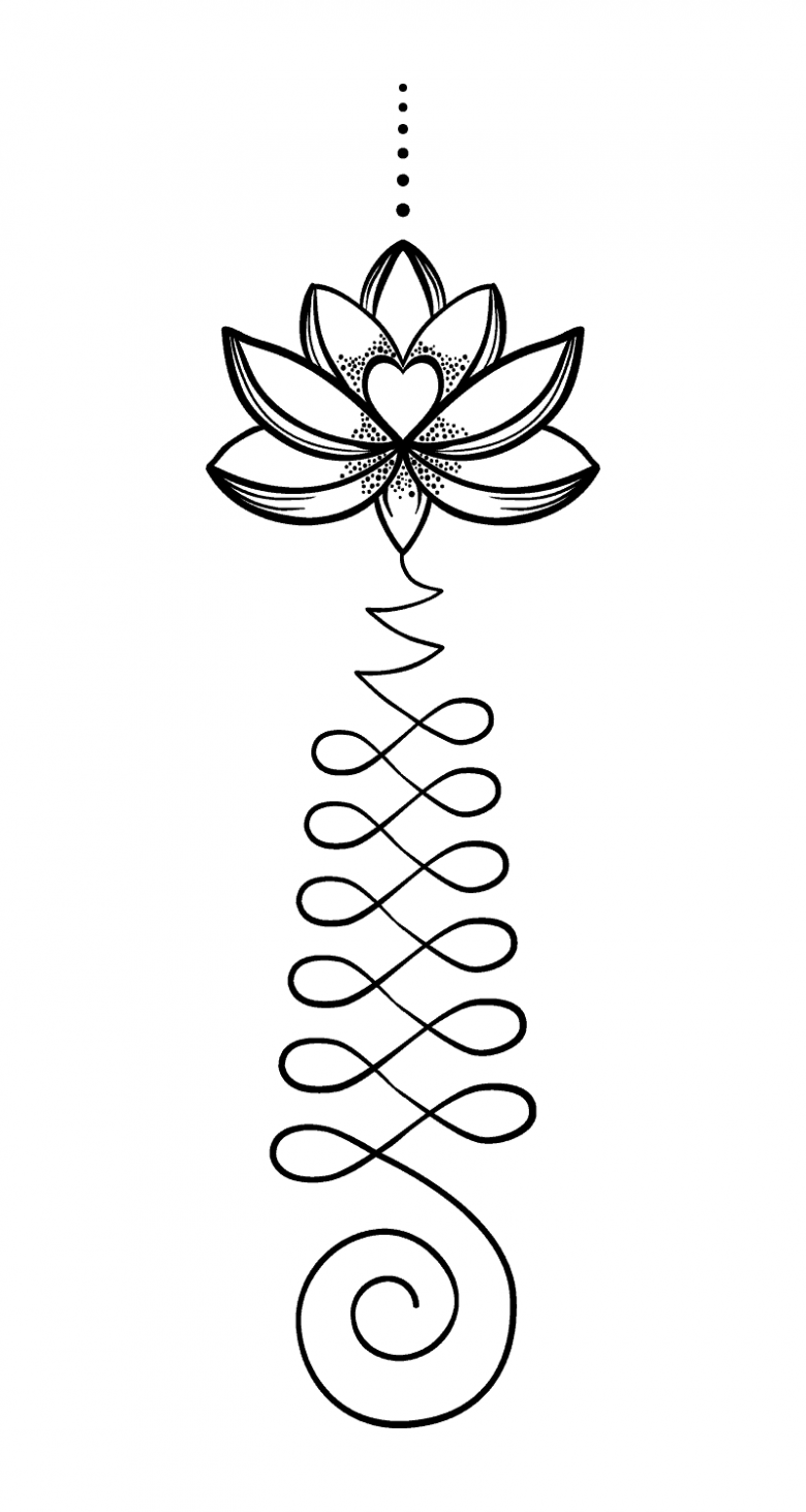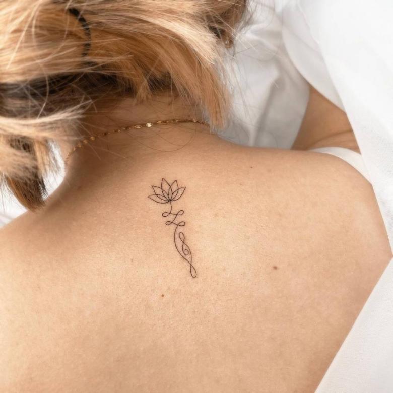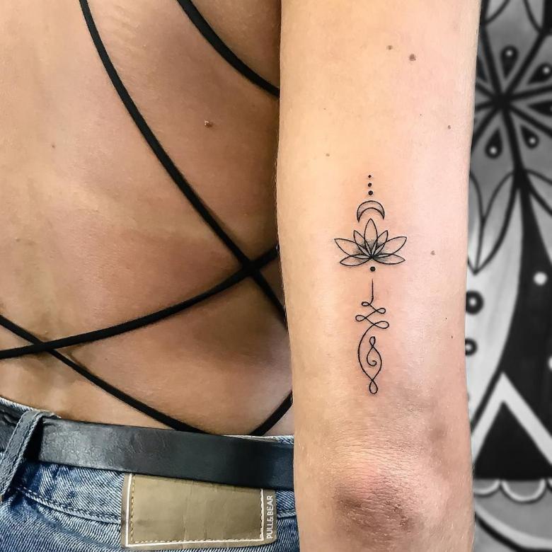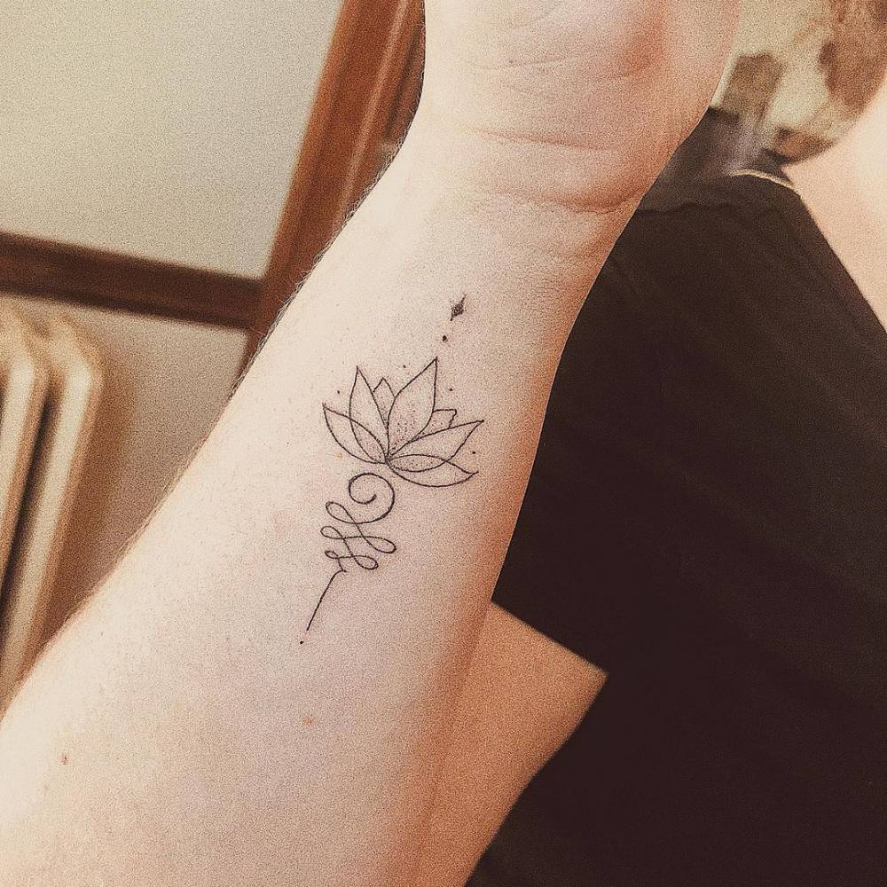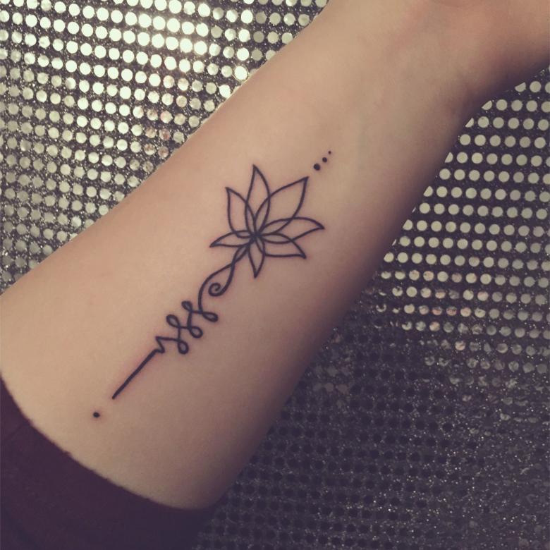 Le symbole est souvent associé à une fleur de lotus. (tatouage de lotus). Cette combinaison se retrouve souvent sur les filles. Le lotus est un symbole de renforcement. Le tatouage d'Unalome avec un lotus évoque la fermeté des décisions, le respect de leurs propres croyances, la pureté de la pensée et de l'action. Le propriétaire du tatouage s'en tiendra strictement au chemin de la découverte de soi. Souvent, les filles choisissent de dessiner le signe du lotus simplement parce qu'il est beau.