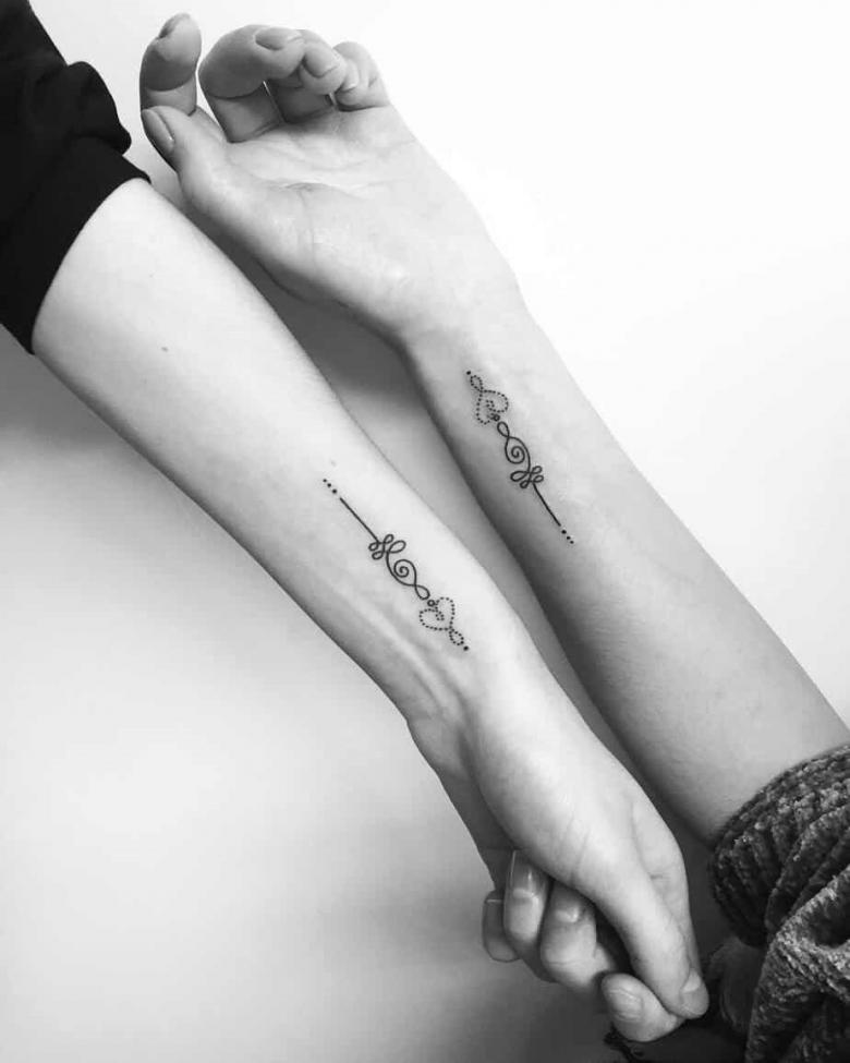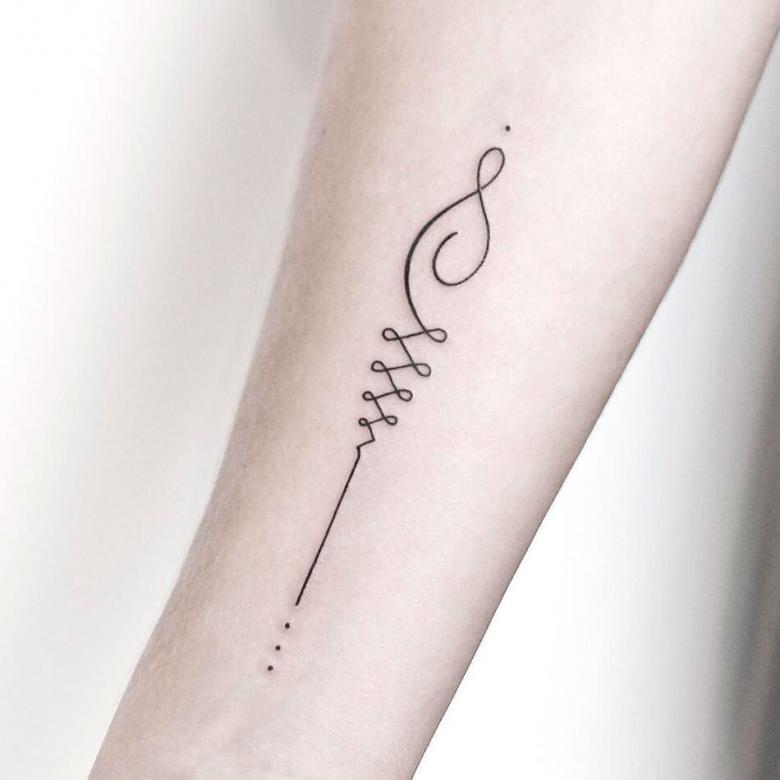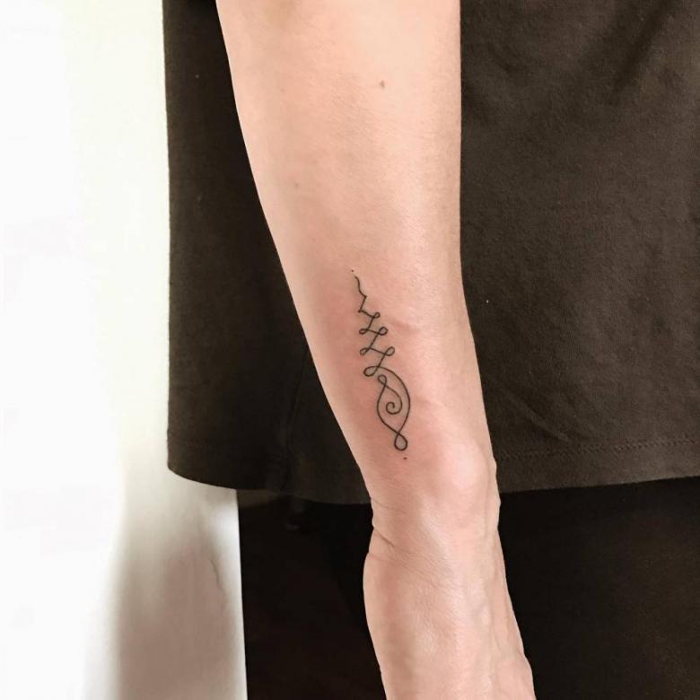 Les motifs du tatouage symbole sont féminins et gracieux. Ils conviennent parfaitement à un look féminin délicat. En choisissant le dessin d'un tatouage avec ce symbole, une fille s'attend à trouver sa propre voie et son but dans celle-ci. Les volutes du symbole signifient le désir de vaincre les défauts et de trouver sa propre identité. Les sections droites du symbole signifient la victoire sur les désaccords internes, l'obtention de la paix de l'esprit. Le point à la fin du signe indique la réalisation du point final.